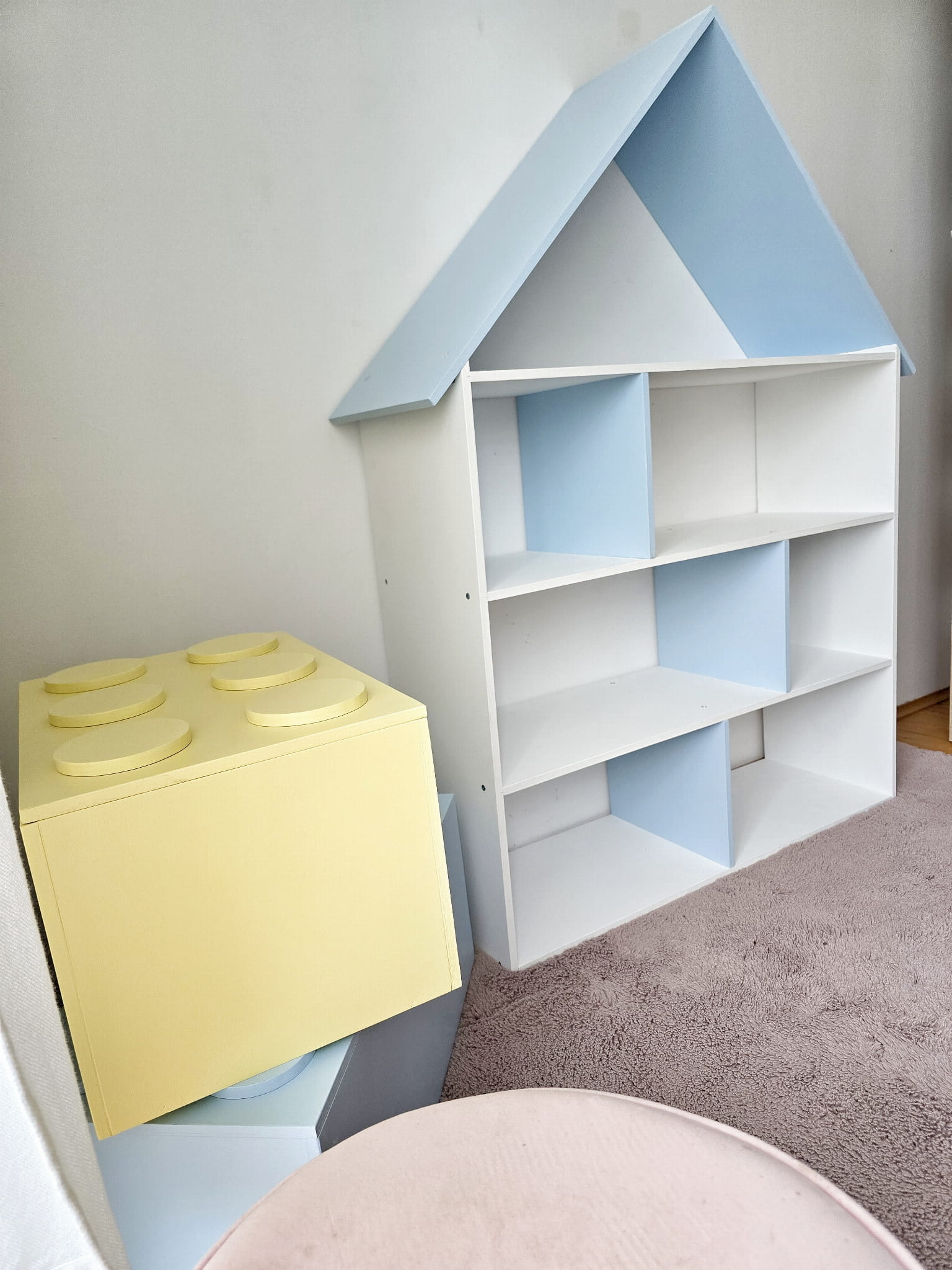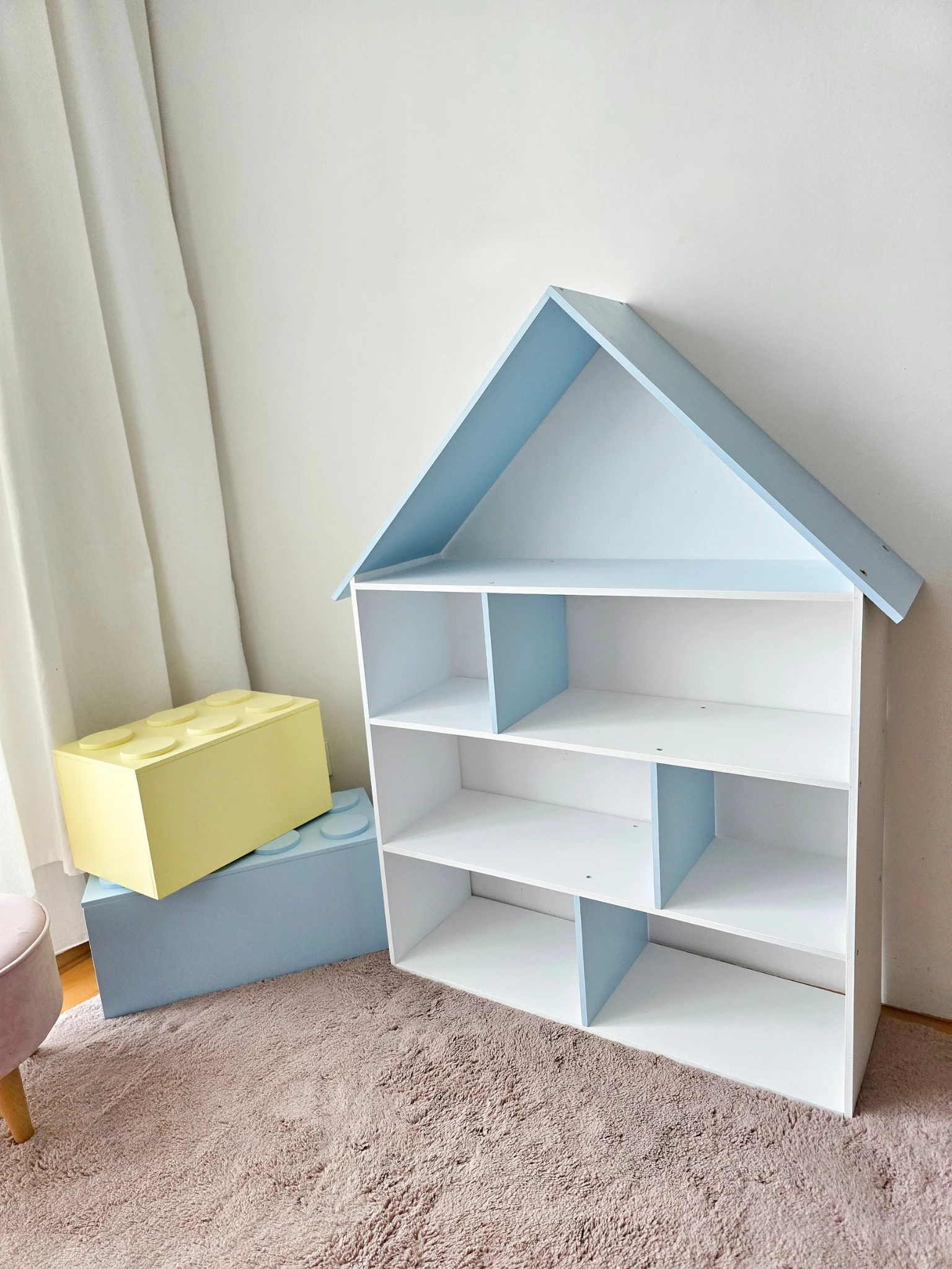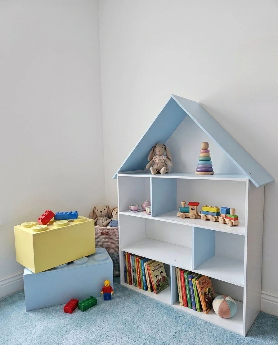 Półka regał na książki i zabawki w kształcie domku wykonany z drewnianej sklejki sosnowej. Regał pomalowany w kolorze białym oraz przegródki i daszek w kolorze błękitnym wodorozcieńczalną emalią akrylową rekomendowaną przez Polskie Towarzystwo Alergologiczne bezpieczne i przeznaczone dla najmłodszych. Regał bez pleców.