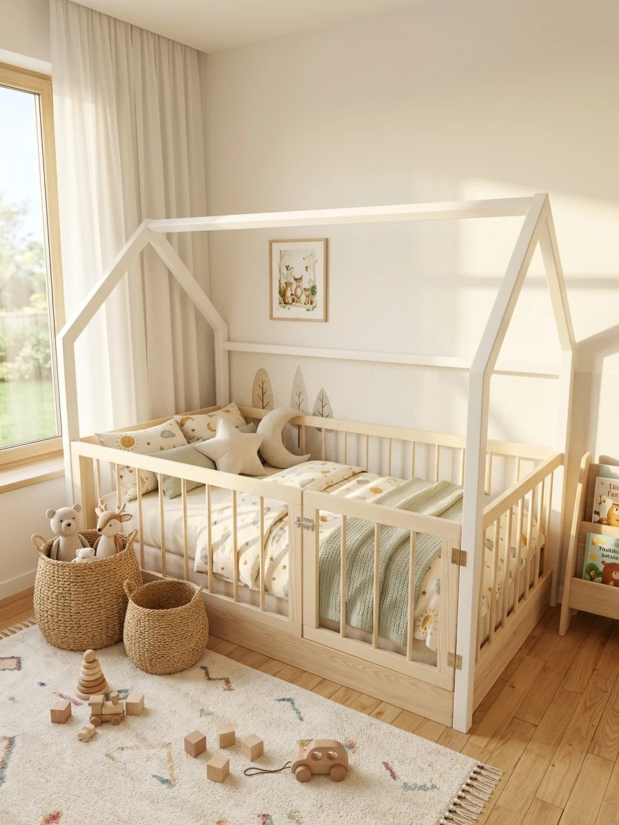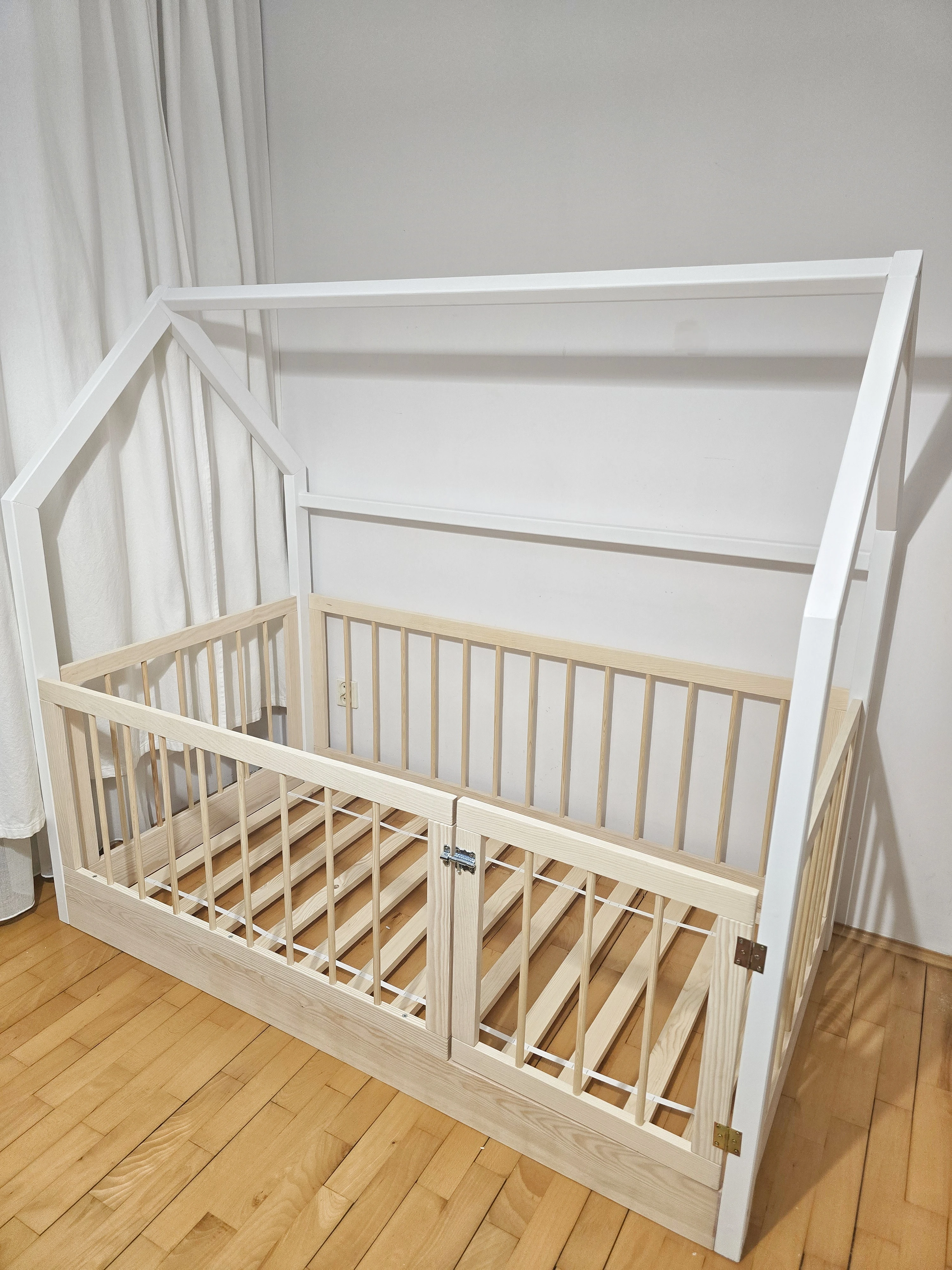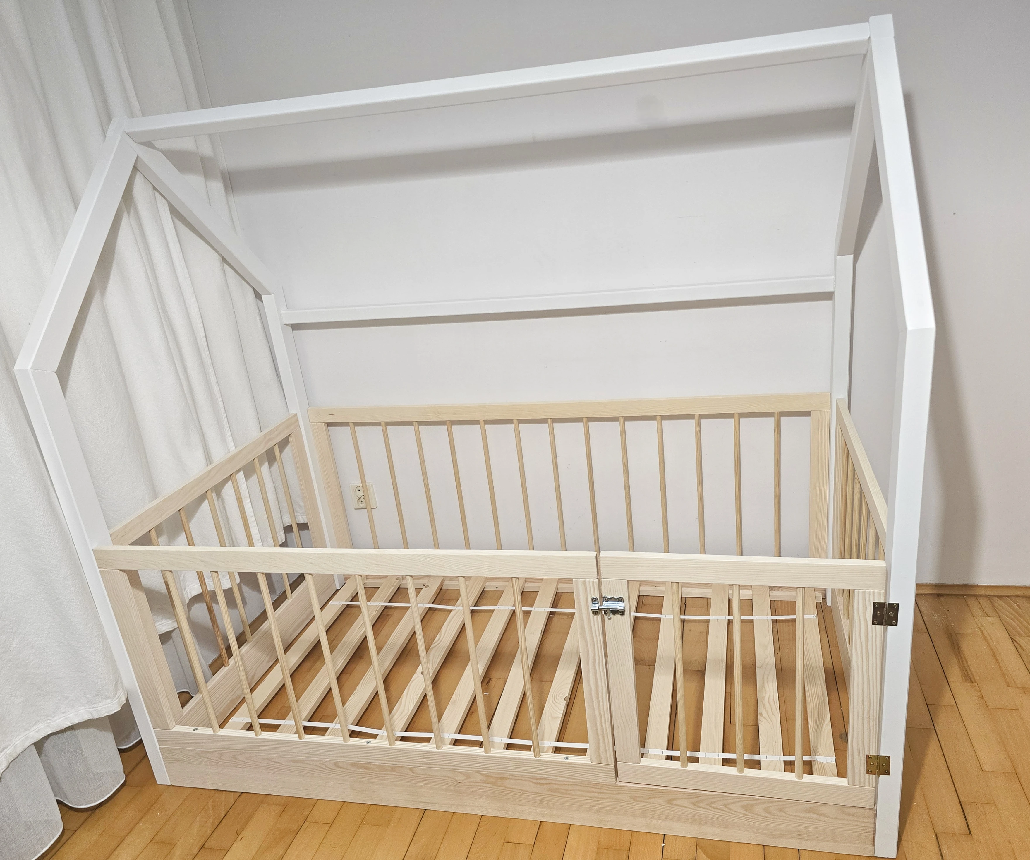 Łóżko domek kojec z bramką i wysokimi barierkami