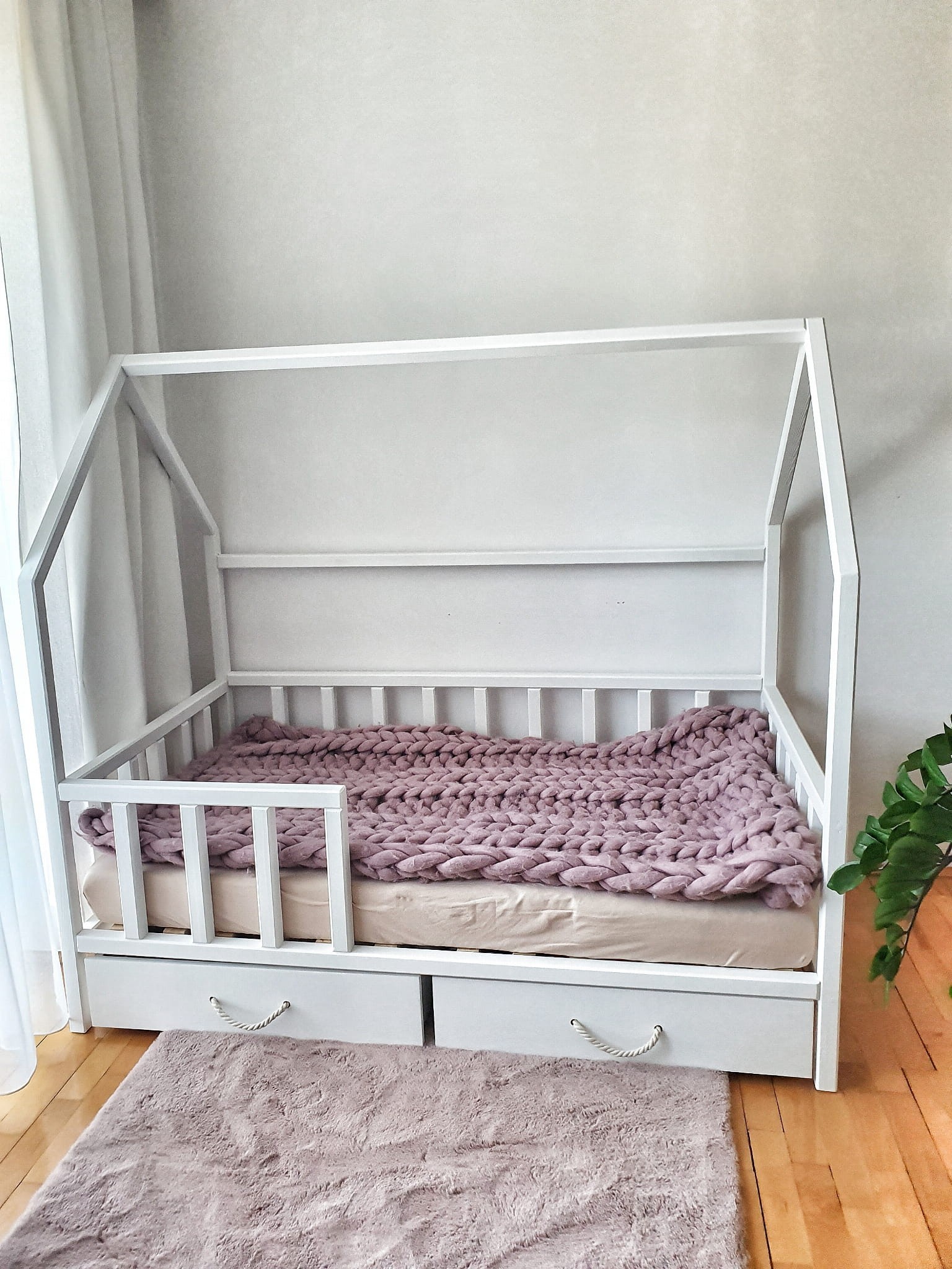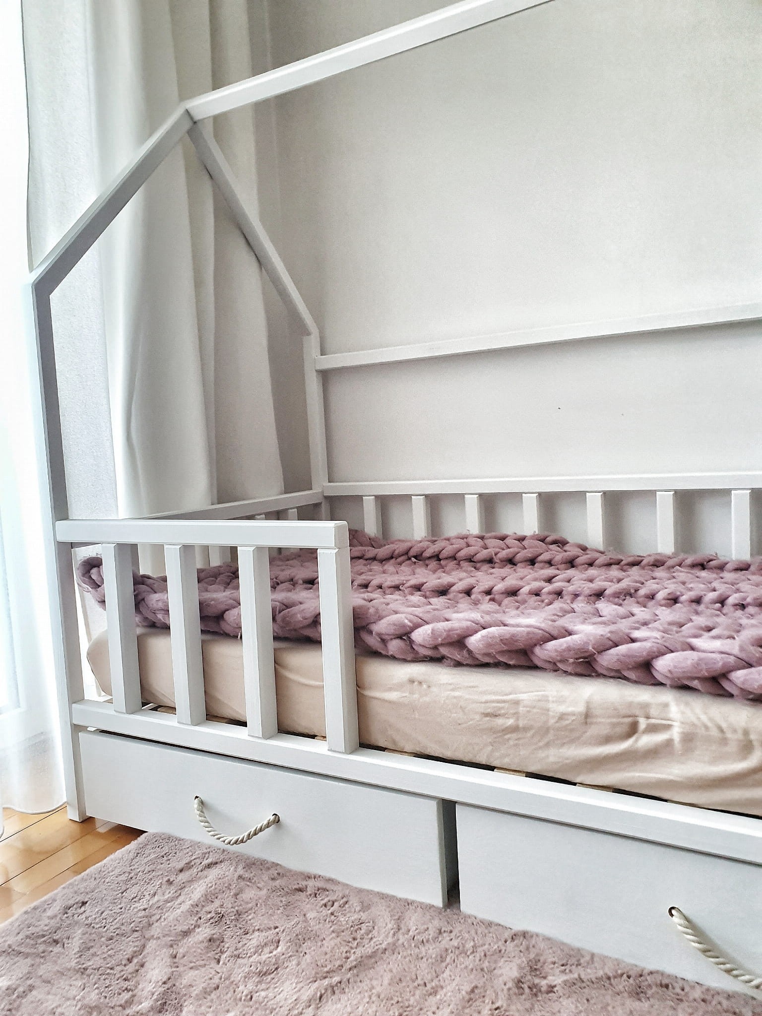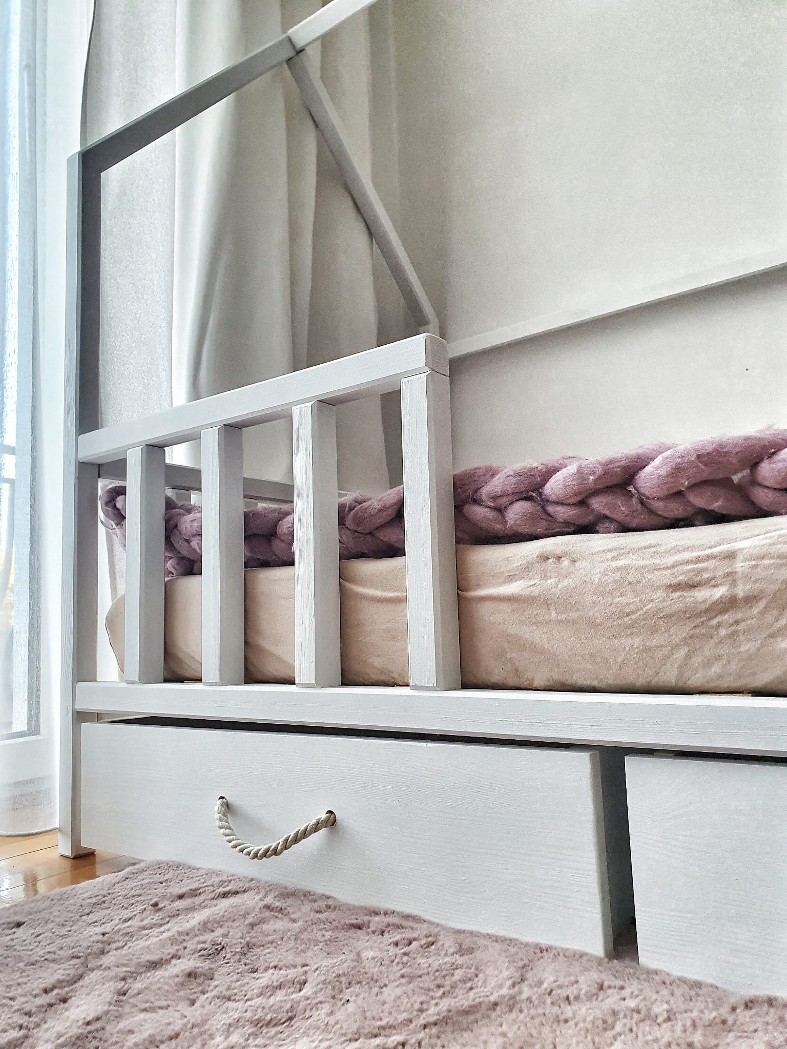 Łóżko wykonane z drewna sosnowego pomalowane białą farbą Akrylową bezpieczną i przeznaczoną dla dzieci Z DREWNIANYM STELAŻEM W CENIE. Łóżko posiada barierki zabezpieczające wokół łóżka. Belki łagodnie wyfrezowane, które eliminują ostre krawędzie. BARIERKA PRZEDNIA DEMONTOWALNA.