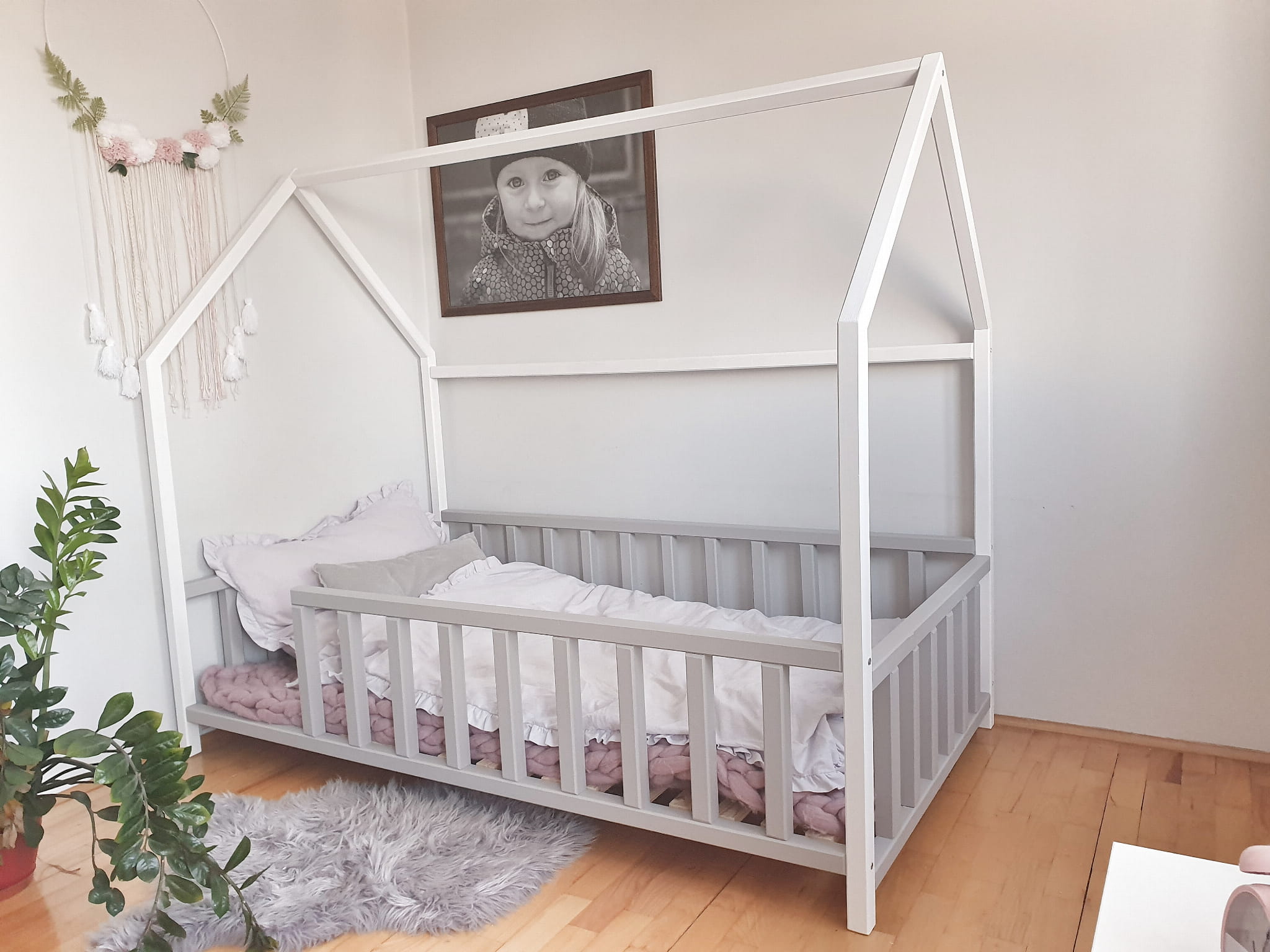 Łóżko domek dziecięce biało szare