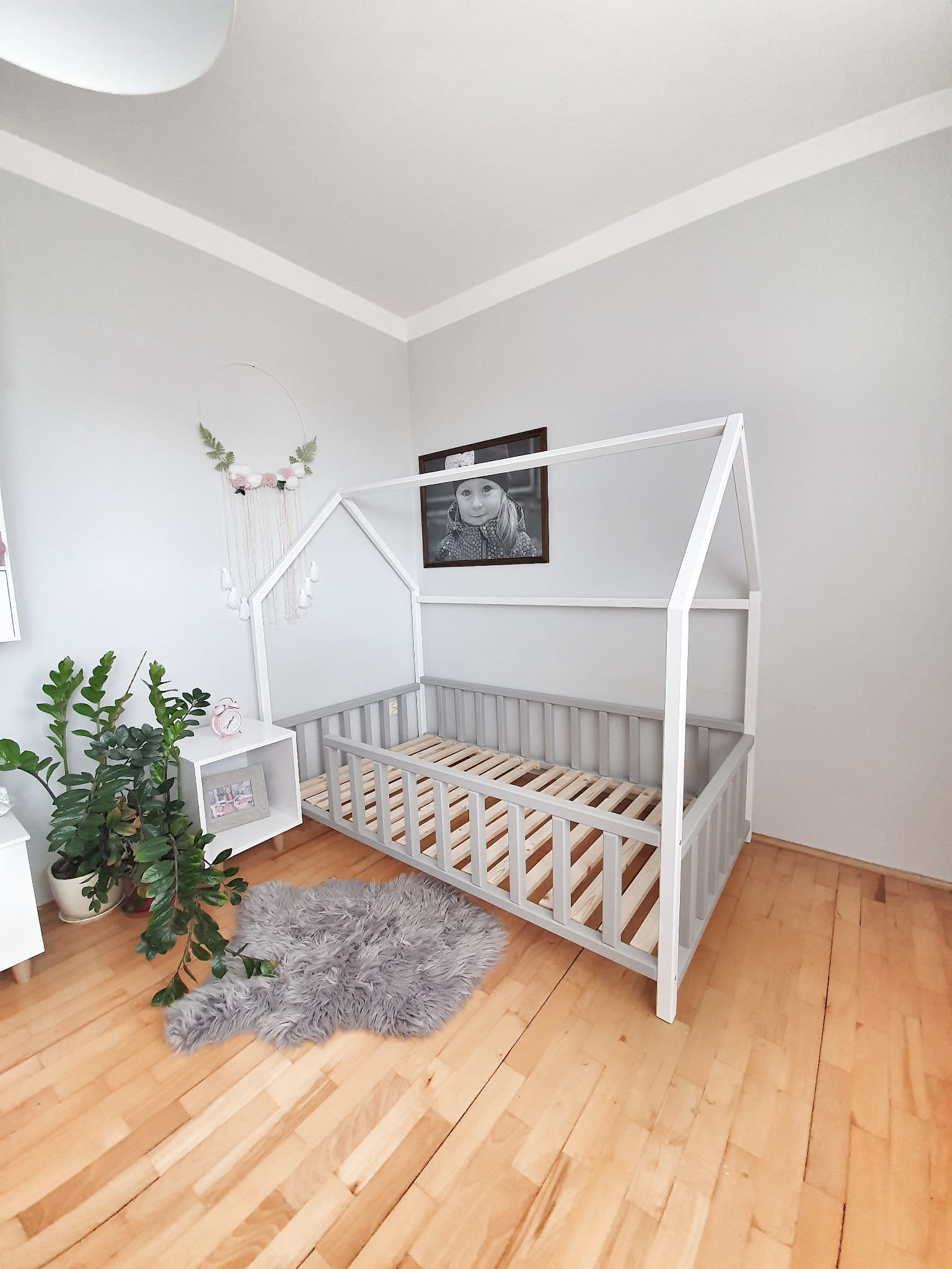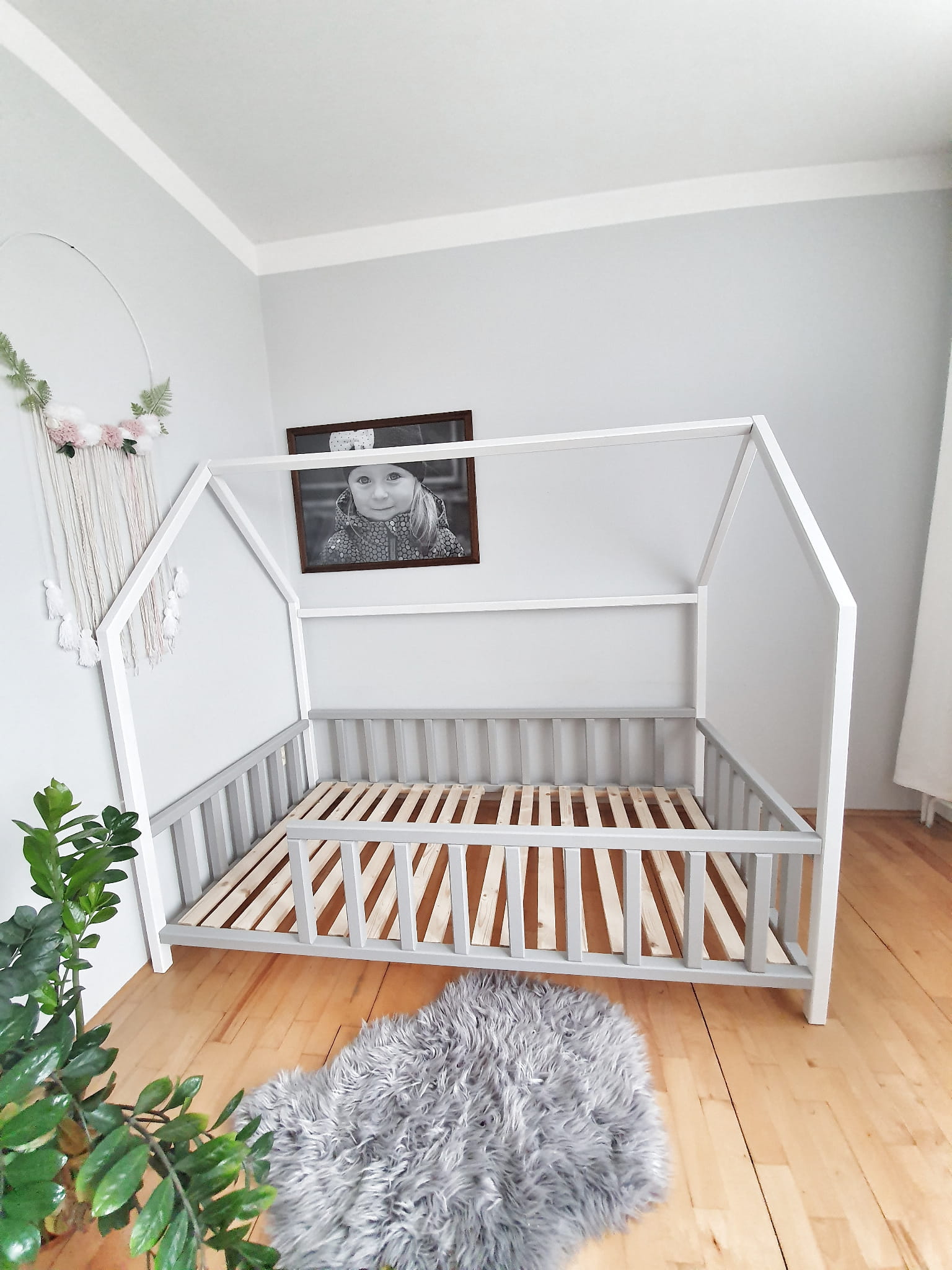 Łóżko wykonane z drewna sosnowego pomalowane białą oraz szarą Ekologiczną Emalią Akrylową bezpieczną i przeznaczoną dla dzieci Z DREWNIANYM STELAŻEM W CENIE. Łóżko posiada barierki zabezpieczające wokół łóżka. Belki łagodnie wyfrezowane, które eliminują ostre krawędzie. BARIERKA PRZEDNIA DEMONTOWALNA.