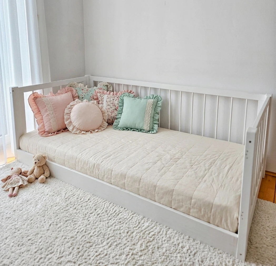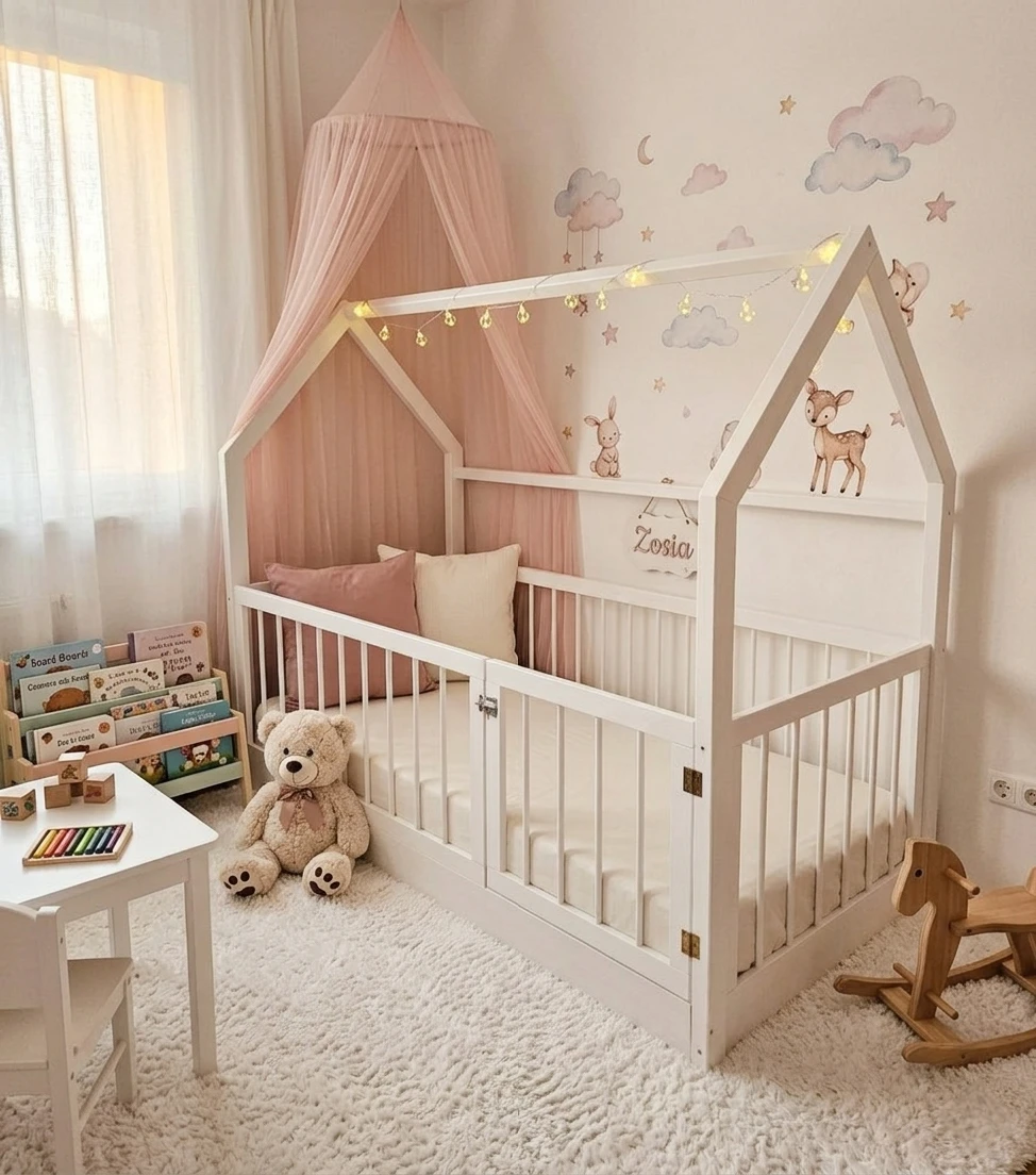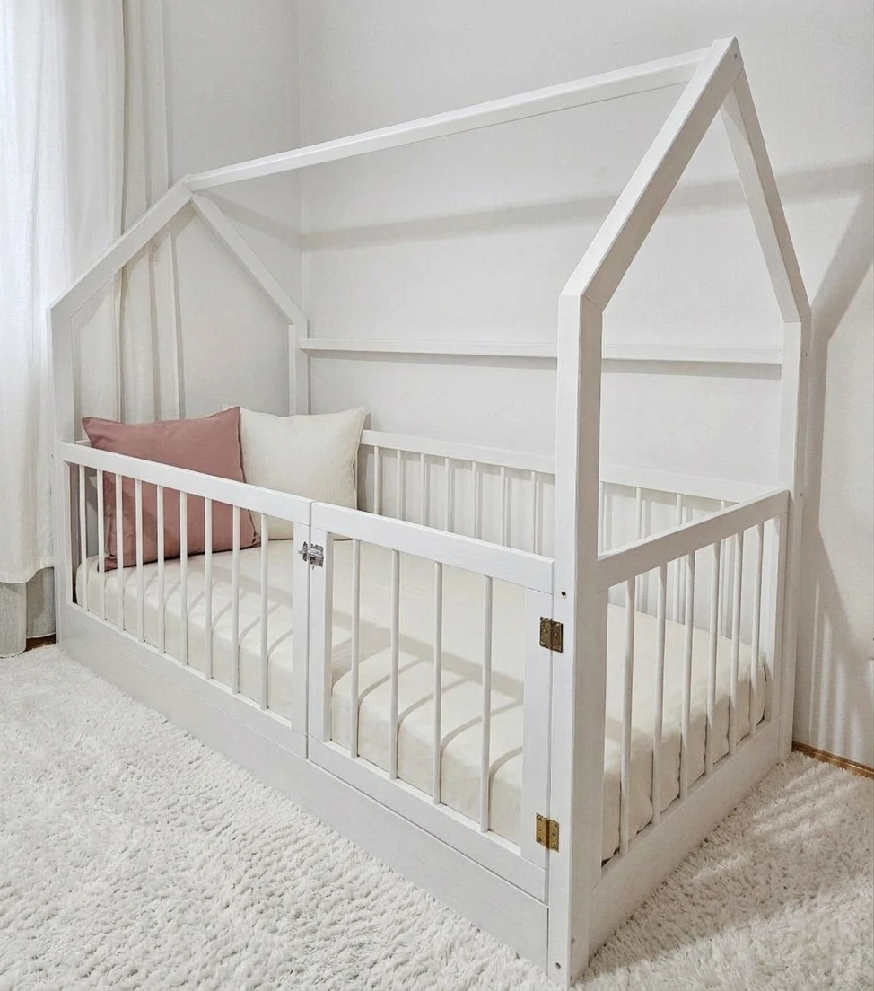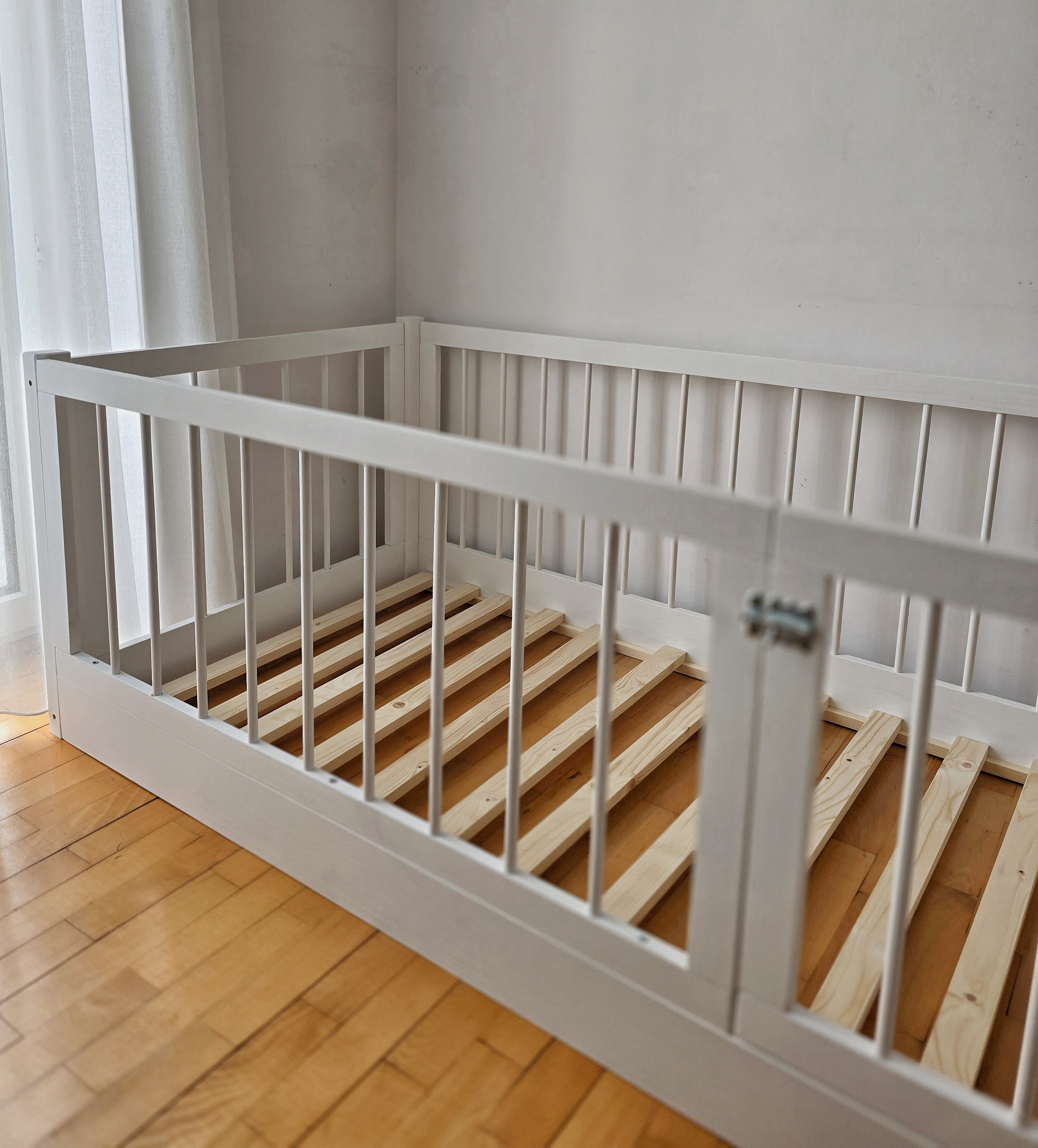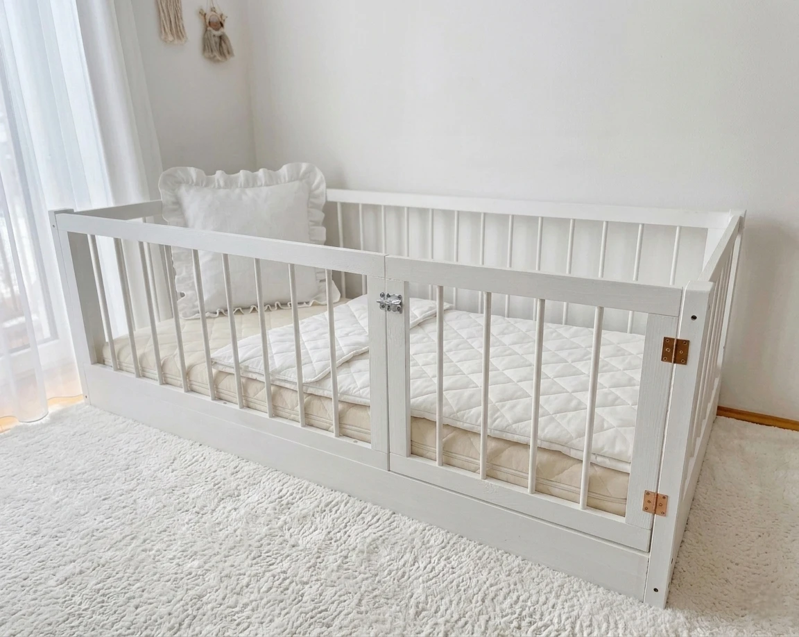 Łóżko drewniane domek białe przypodłogowe 2w1 z wymiennymi nóżkami, kojec z bramką i wysokimi okrągłymi szczebelkami