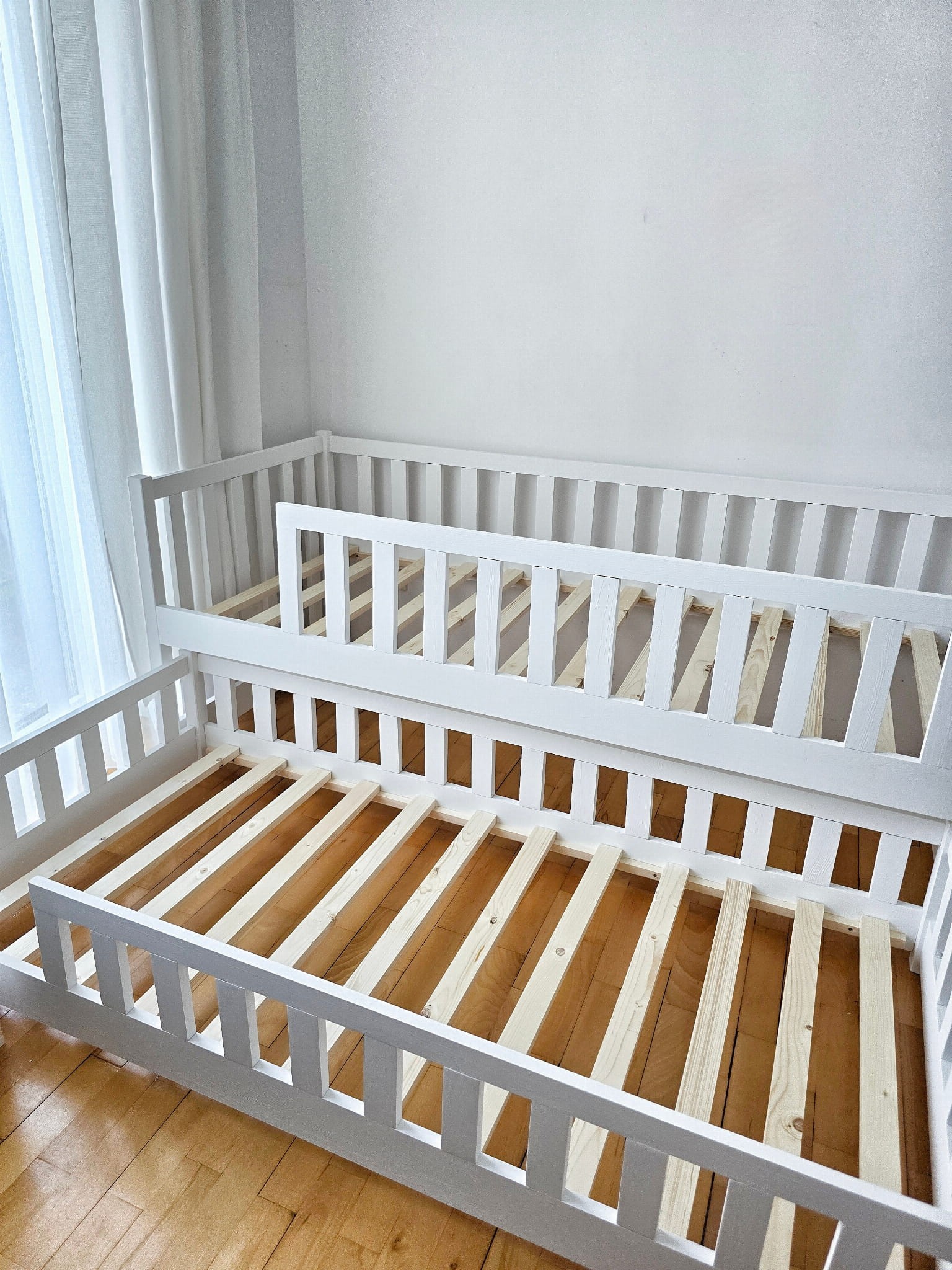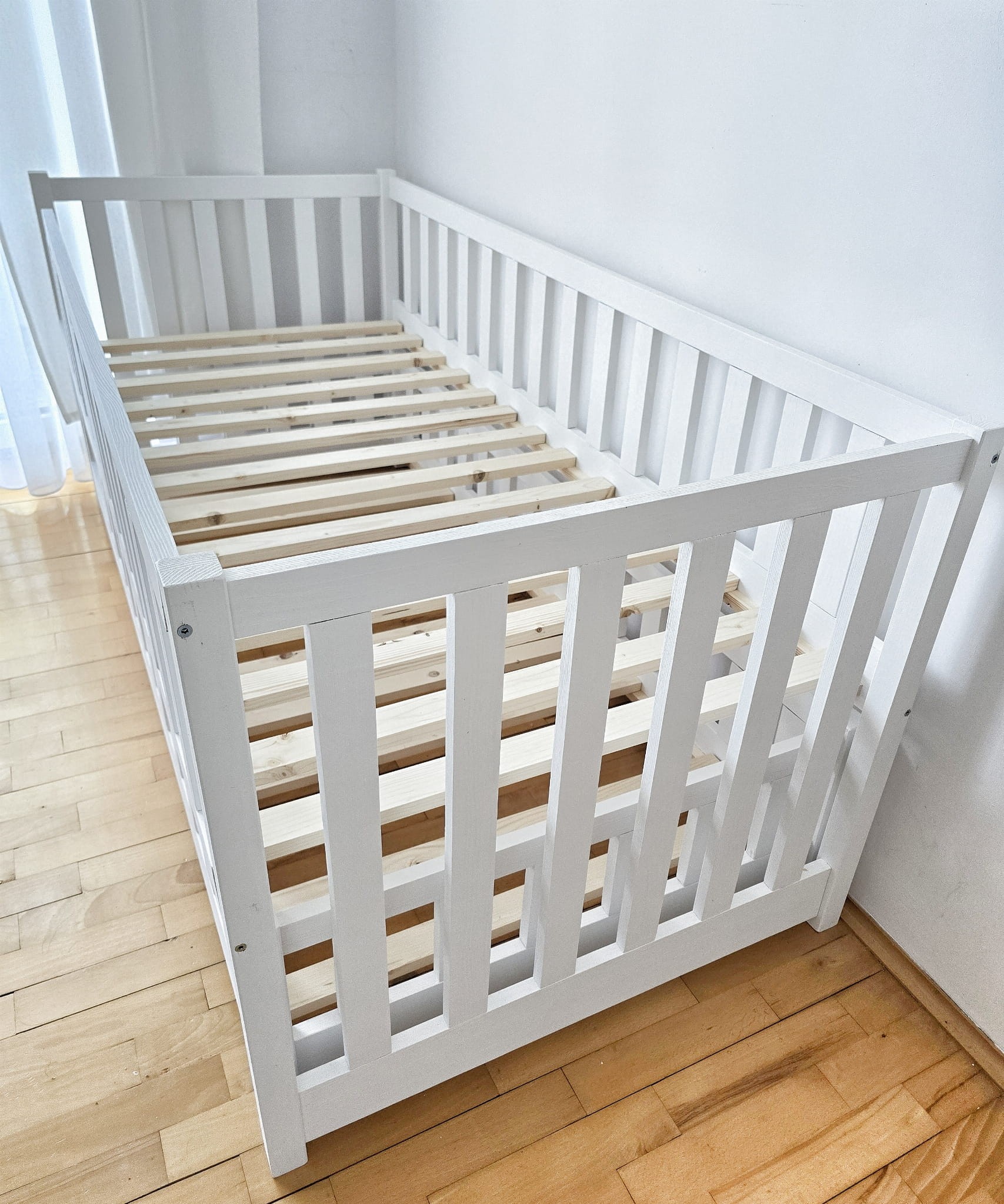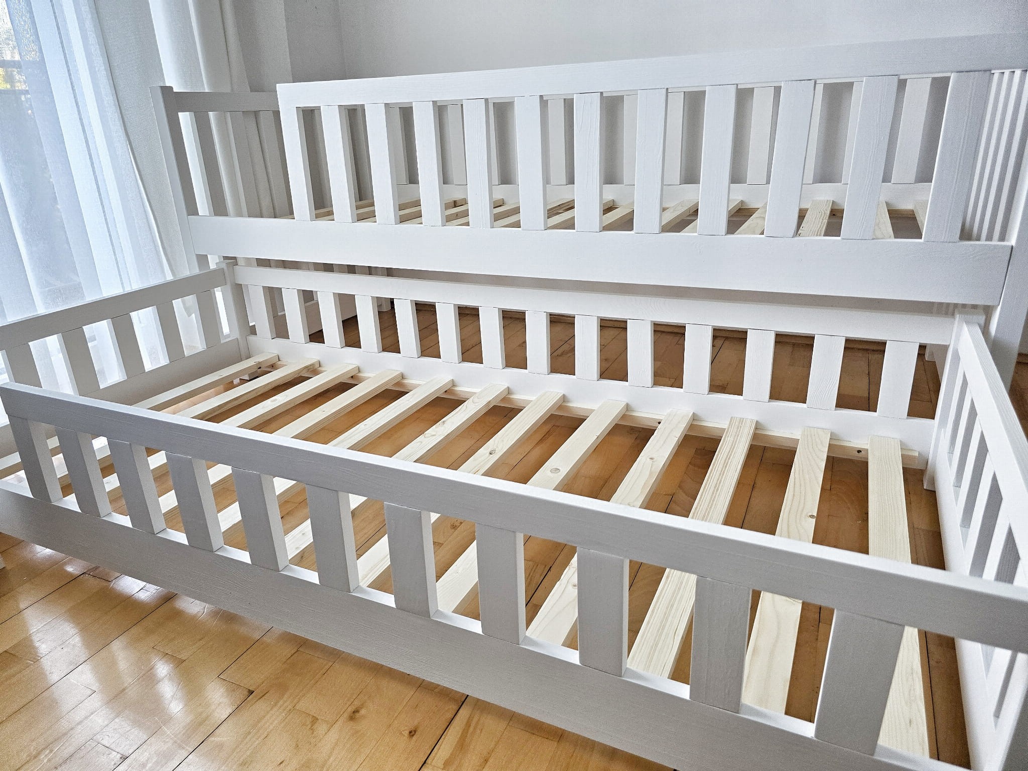 Łóżka wykonane z drewna sosnowego pomalowane białą Ekologiczną Emalią Akrylową bezpieczną i przeznaczoną dla dzieci Z DREWNIANYM STELAŻEM W CENIE. Łóżka posiadają barierki zabezpieczające wokół łóżka.