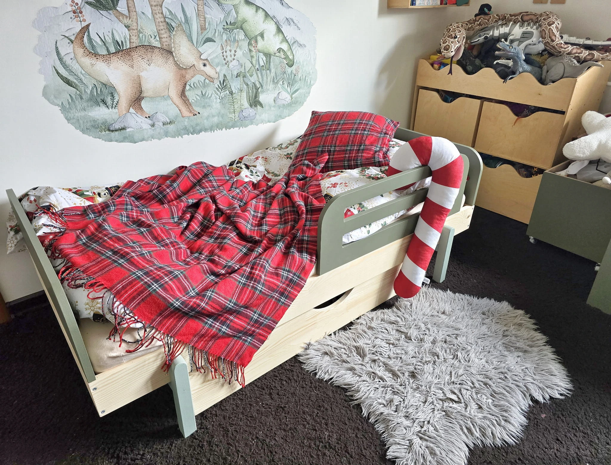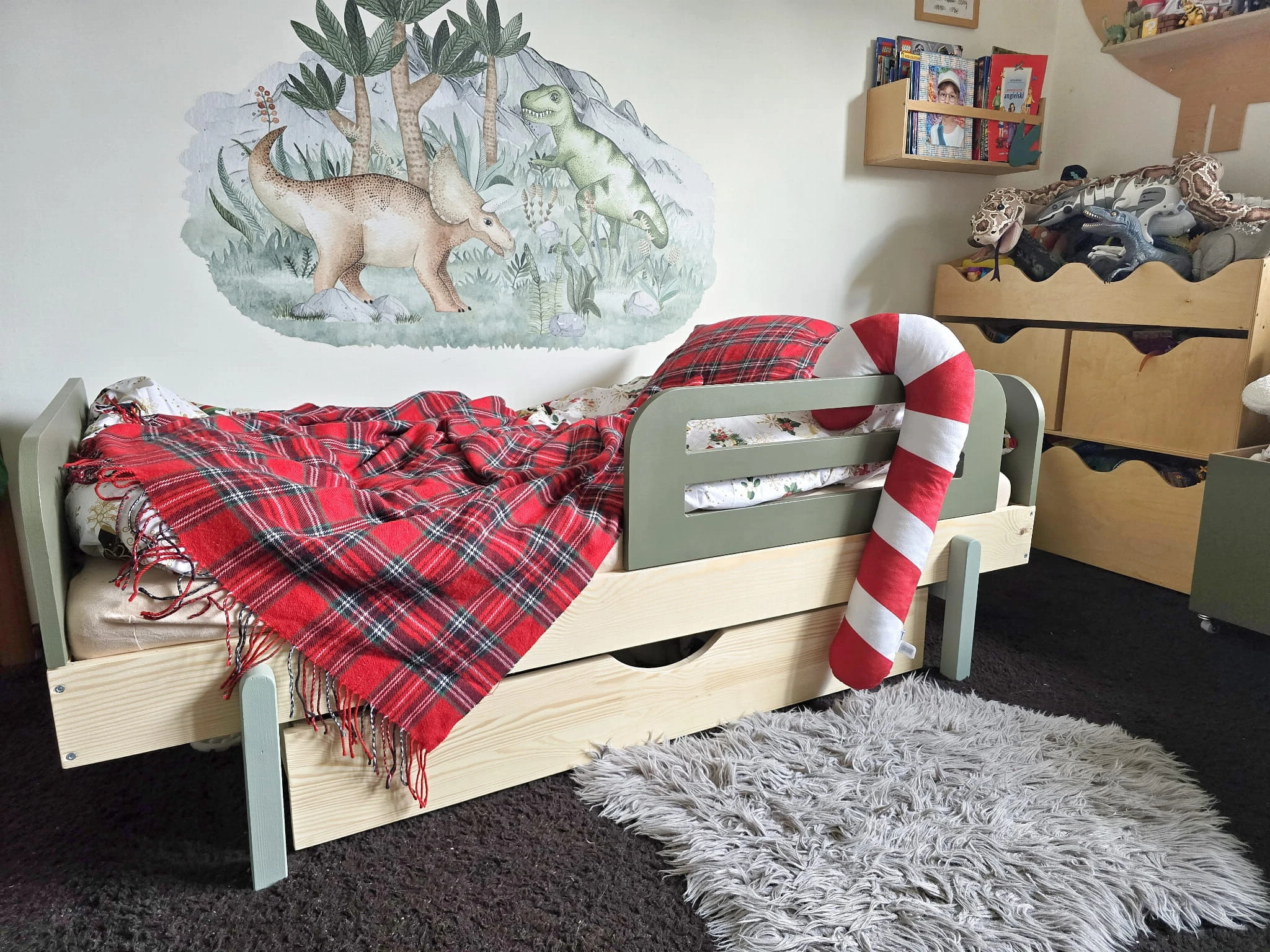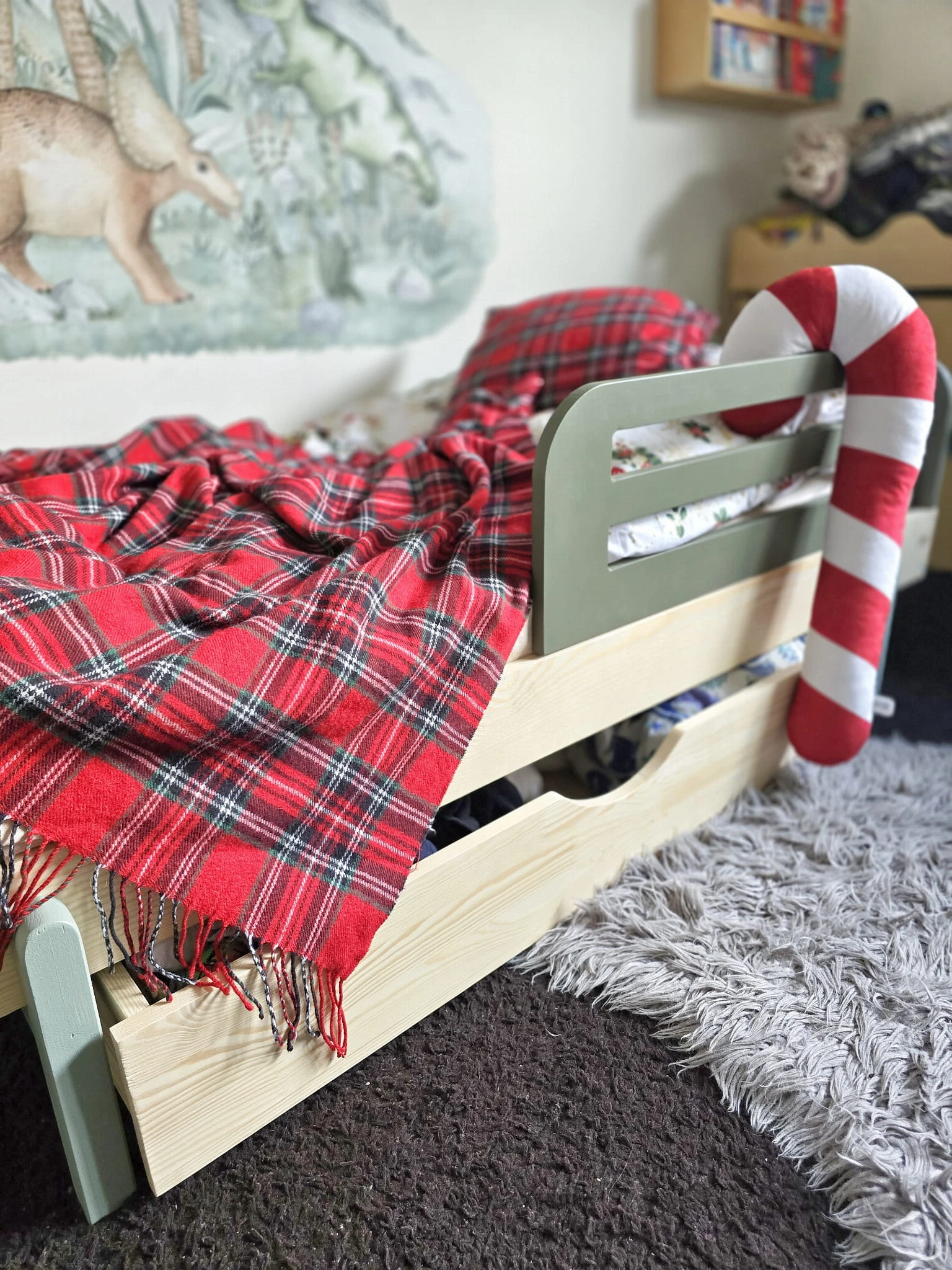 Łóżko wykonane z drewna sosnowego oraz wysokiej klasy płyty MDF zagłówki oraz barierka pomalowane zieloną Emalią Akrylową przeznaczoną i bezpieczną dla dzieci nóżki w kolorze szałwii oraz rama pomalowana matowym bezbarwnym lakierem Z DREWNIANYM STELAŻEM W CENIE.