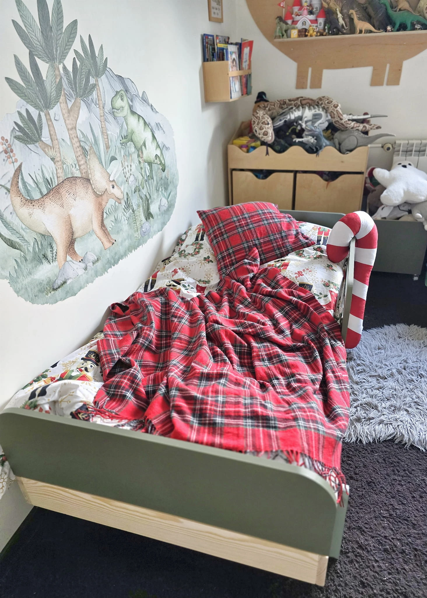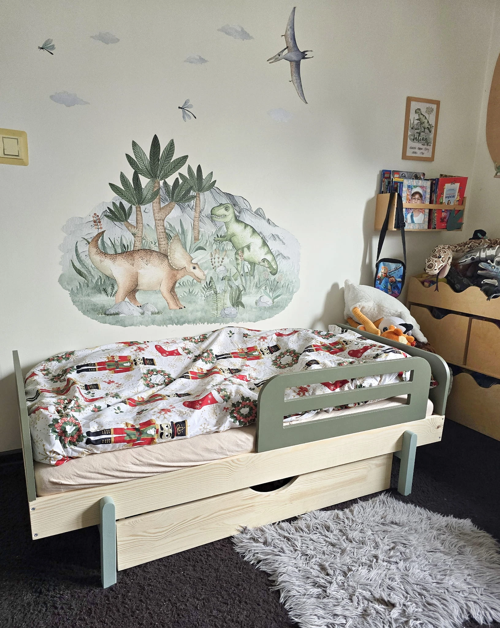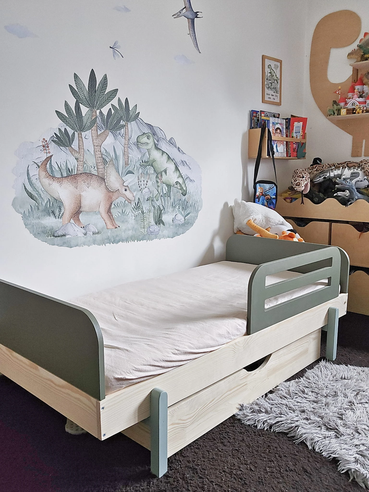 Łóżko wykonane z drewna sosnowego oraz wysokiej klasy płyty MDF zagłówki oraz barierka pomalowane zieloną Emalią Akrylową przeznaczoną i bezpieczną dla dzieci nóżki w kolorze szałwii oraz rama pomalowana matowym bezbarwnym lakierem Z DREWNIANYM STELAŻEM W CENIE.
