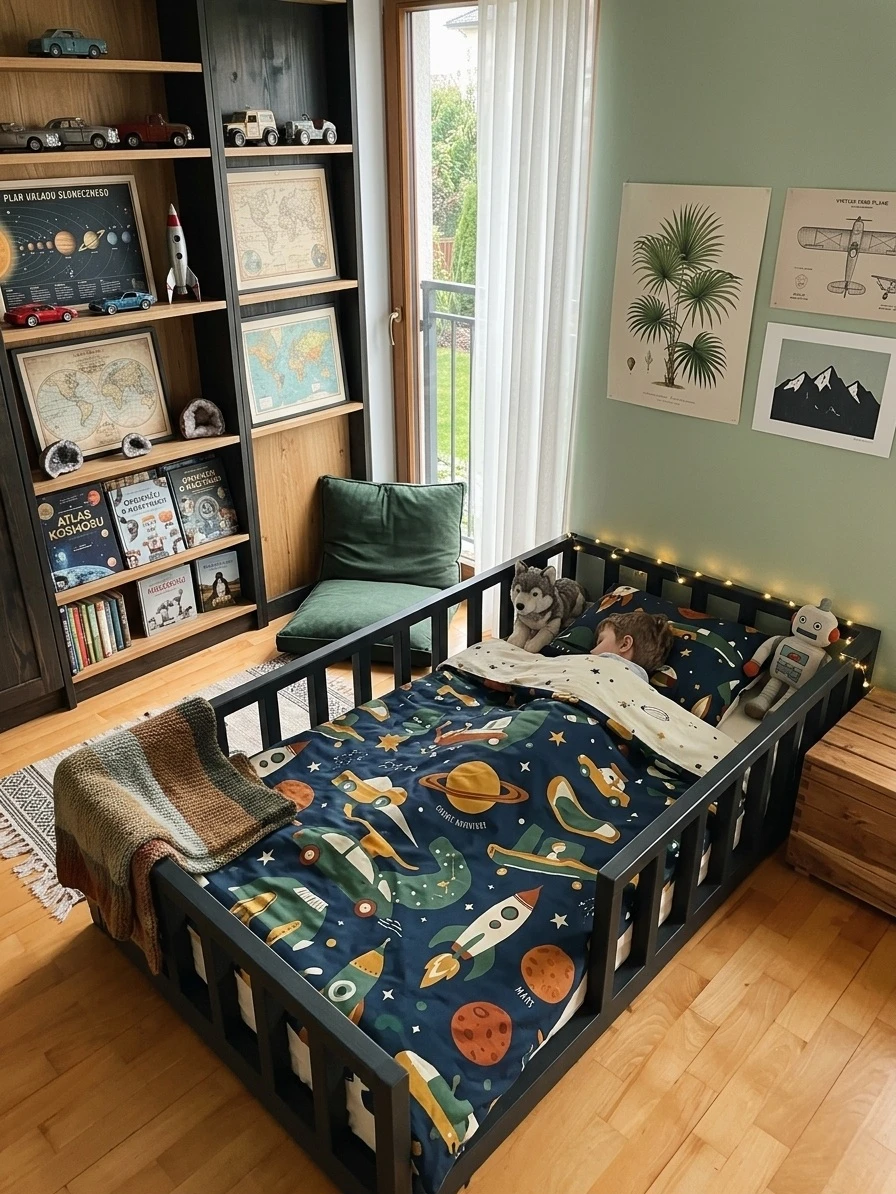 Łóżko znajduje się bezpośrednio na ziemi, posiada barierki zabezpieczające wokół łóżka. Belki łagodnie wyfrezowane, które eliminują ostre krawędzie. BARIERKA PRZEDNIA DEMONTOWALNA.