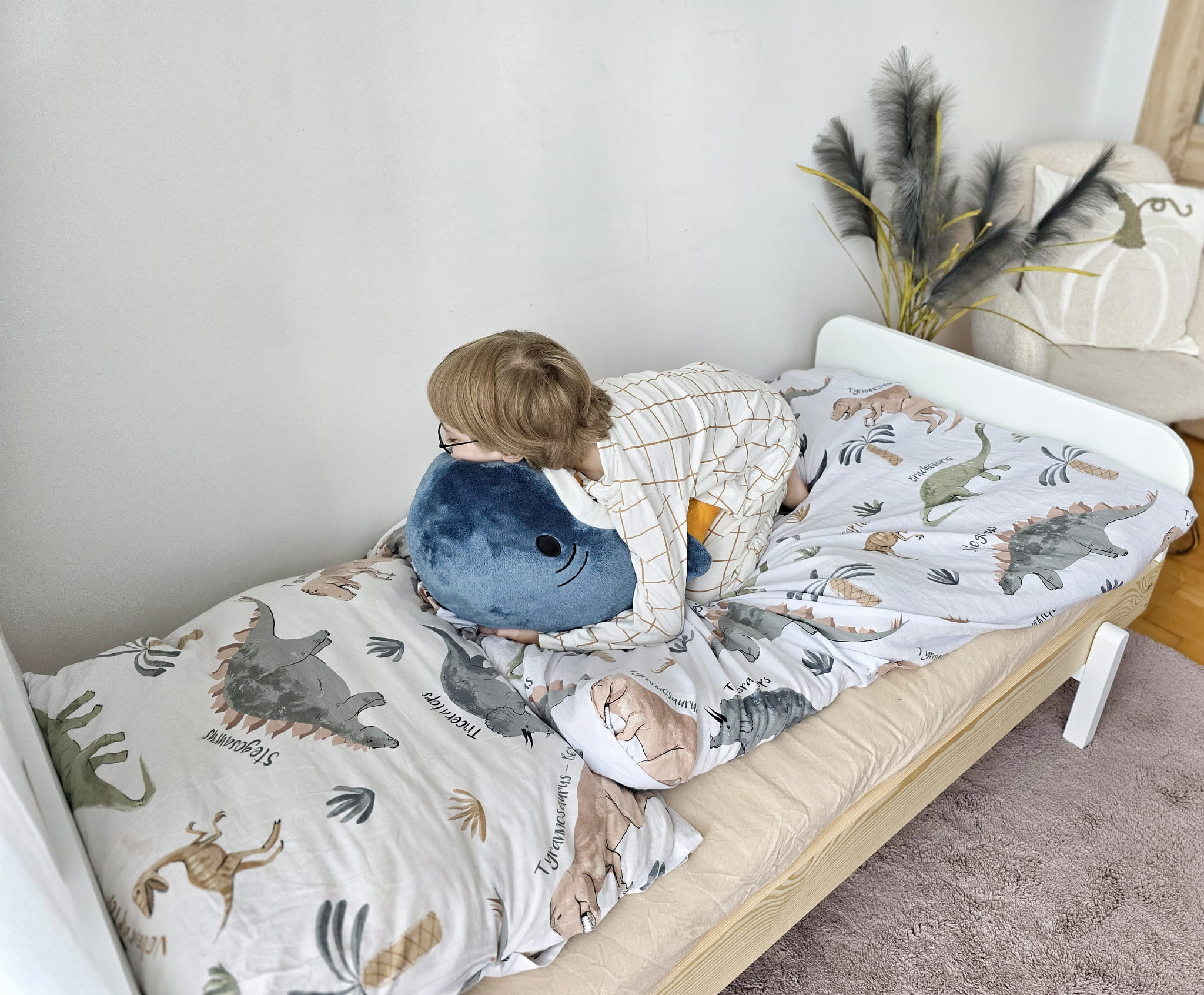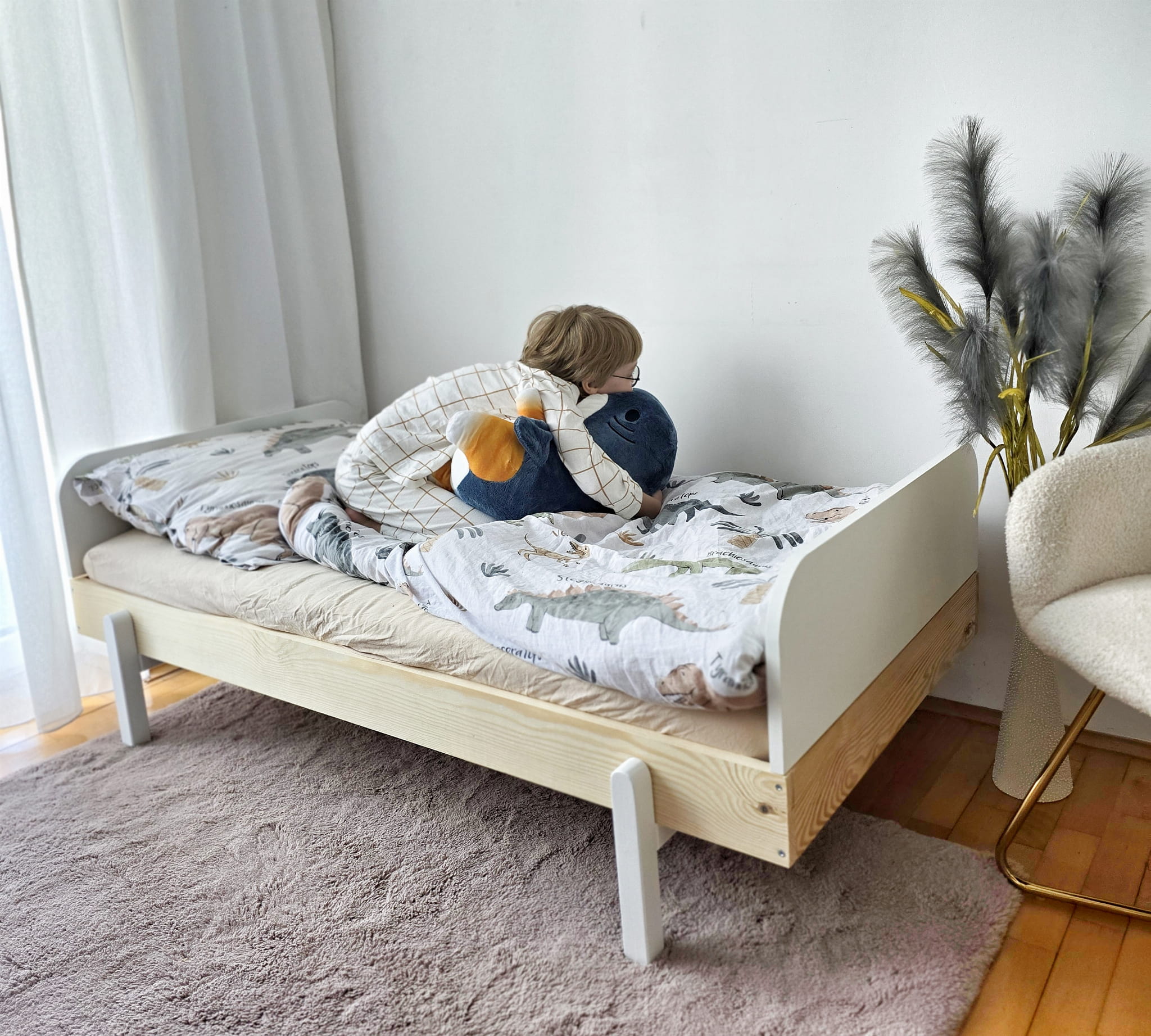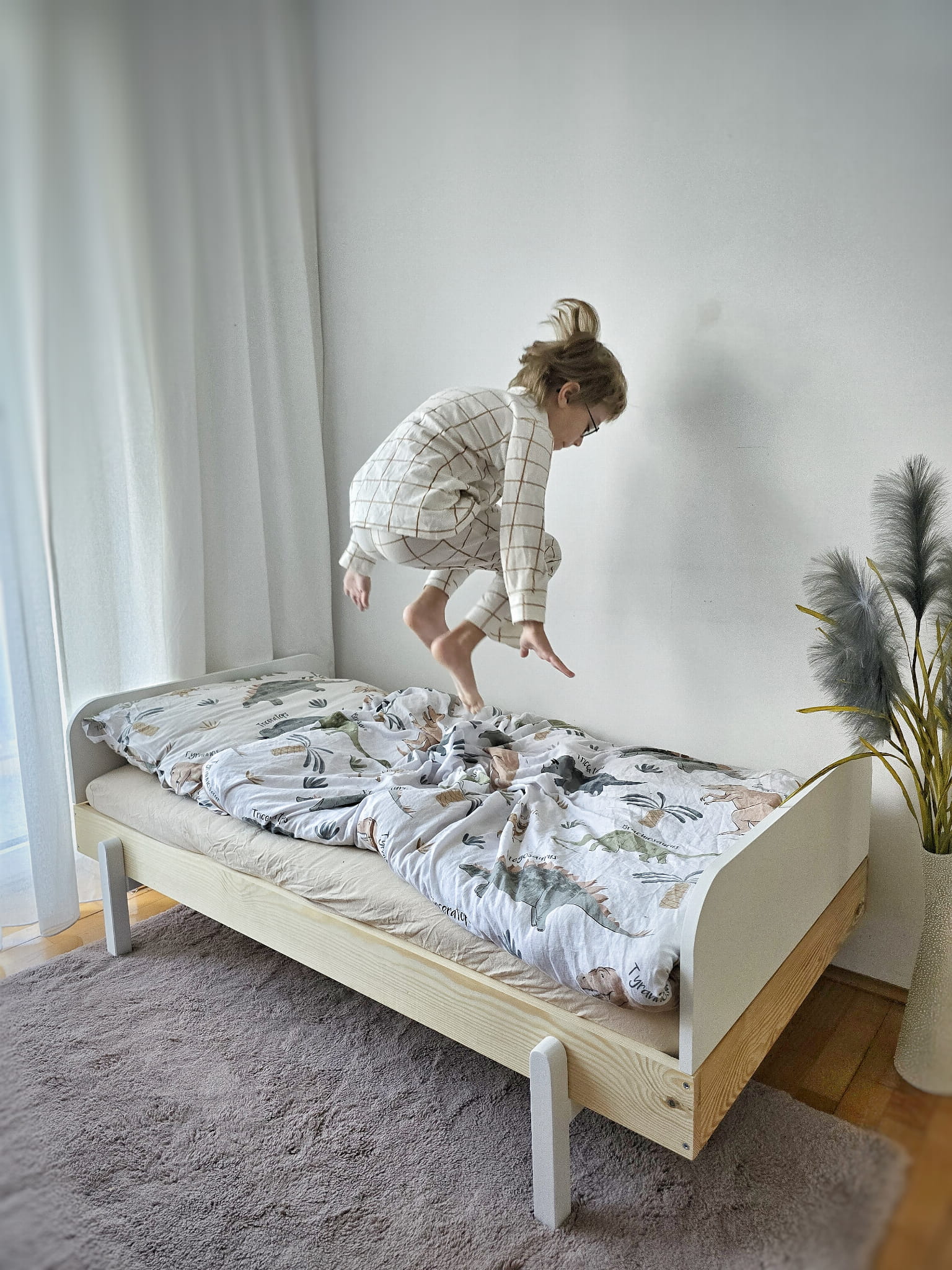 Łóżko wykonane z drewna sosnowego oraz wysokiej klasy płyty MDF i nóżki pomalowane białą Emalią Akrylową przeznaczoną i bezpieczną dla dzieci oraz matowym bezbarwnym lakierem Z DREWNIANYM STELAŻEM W CENIE.