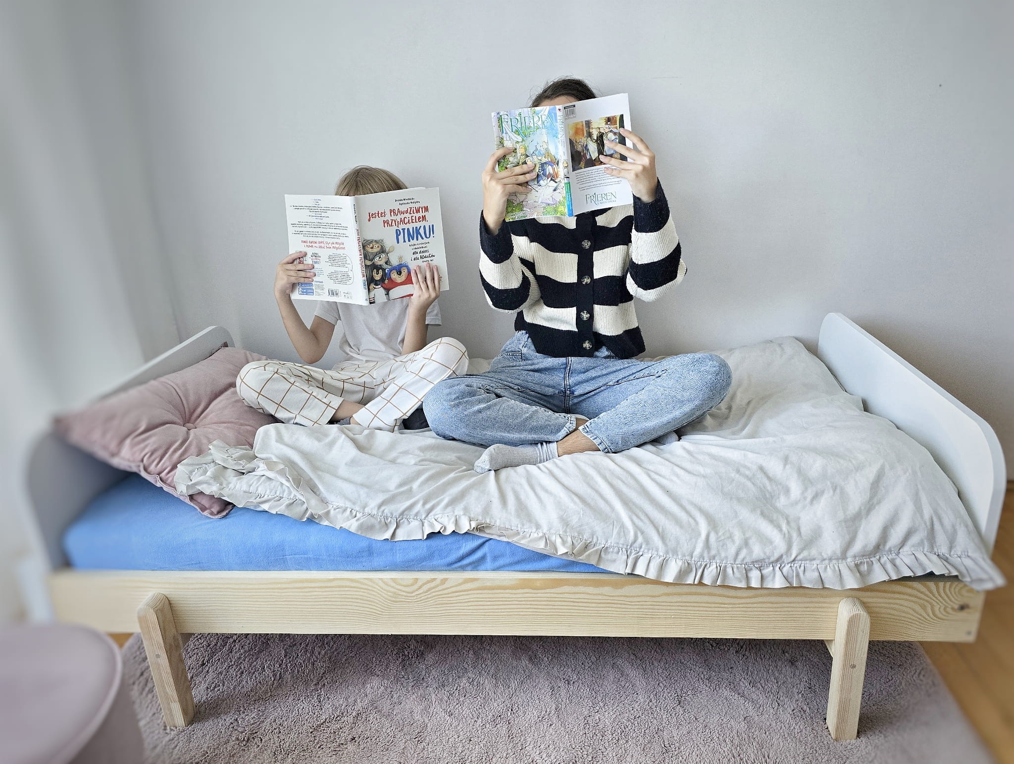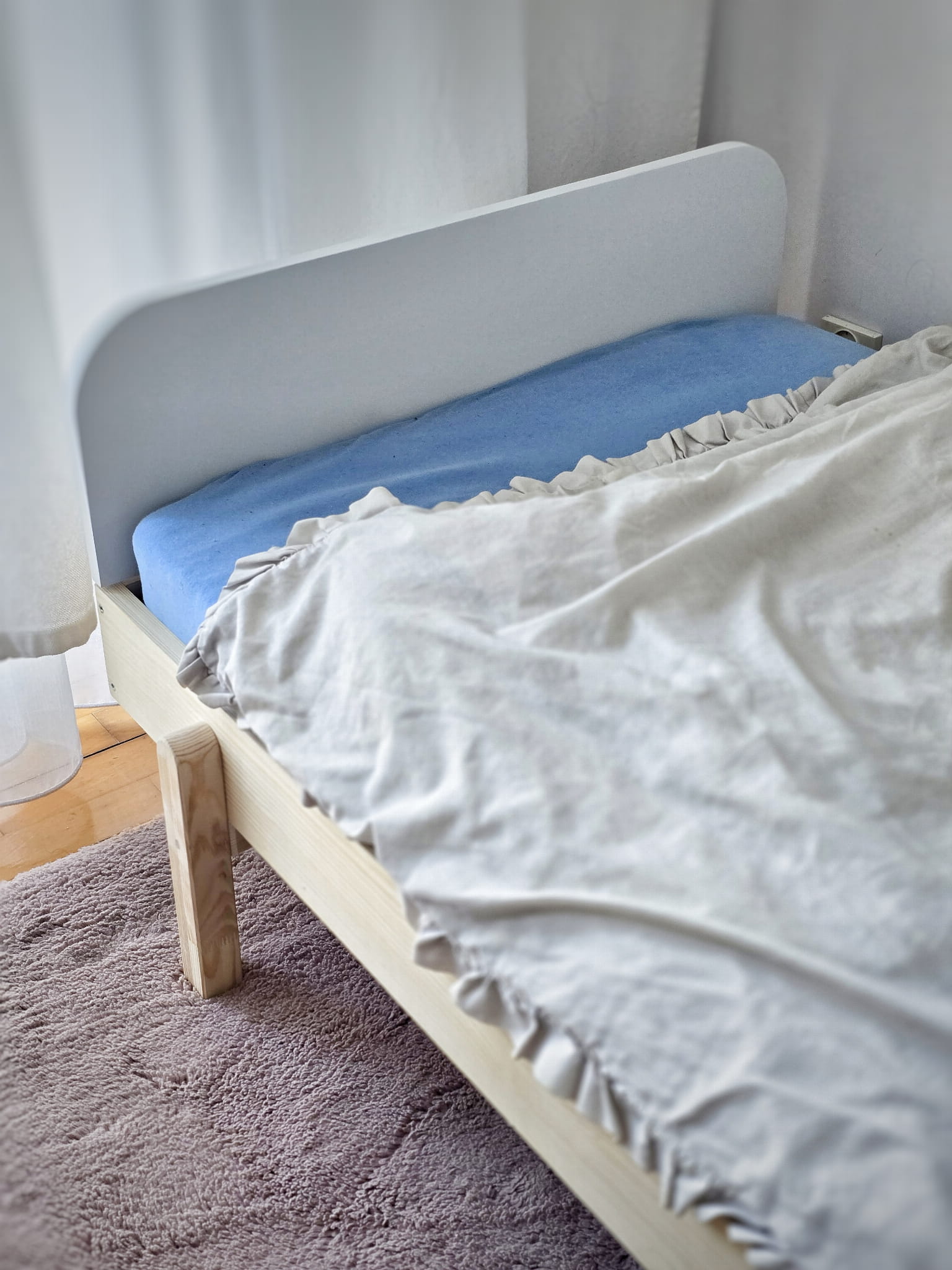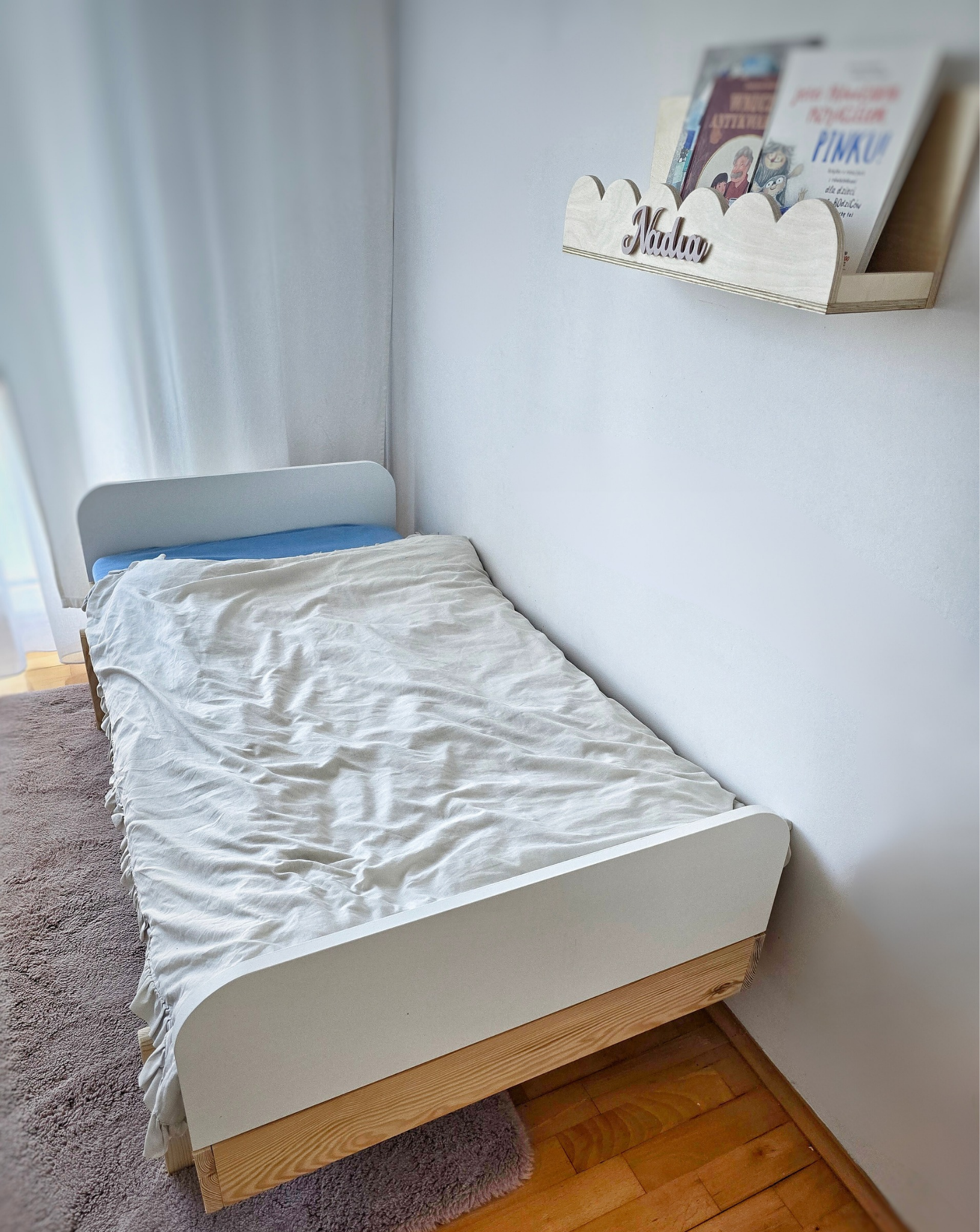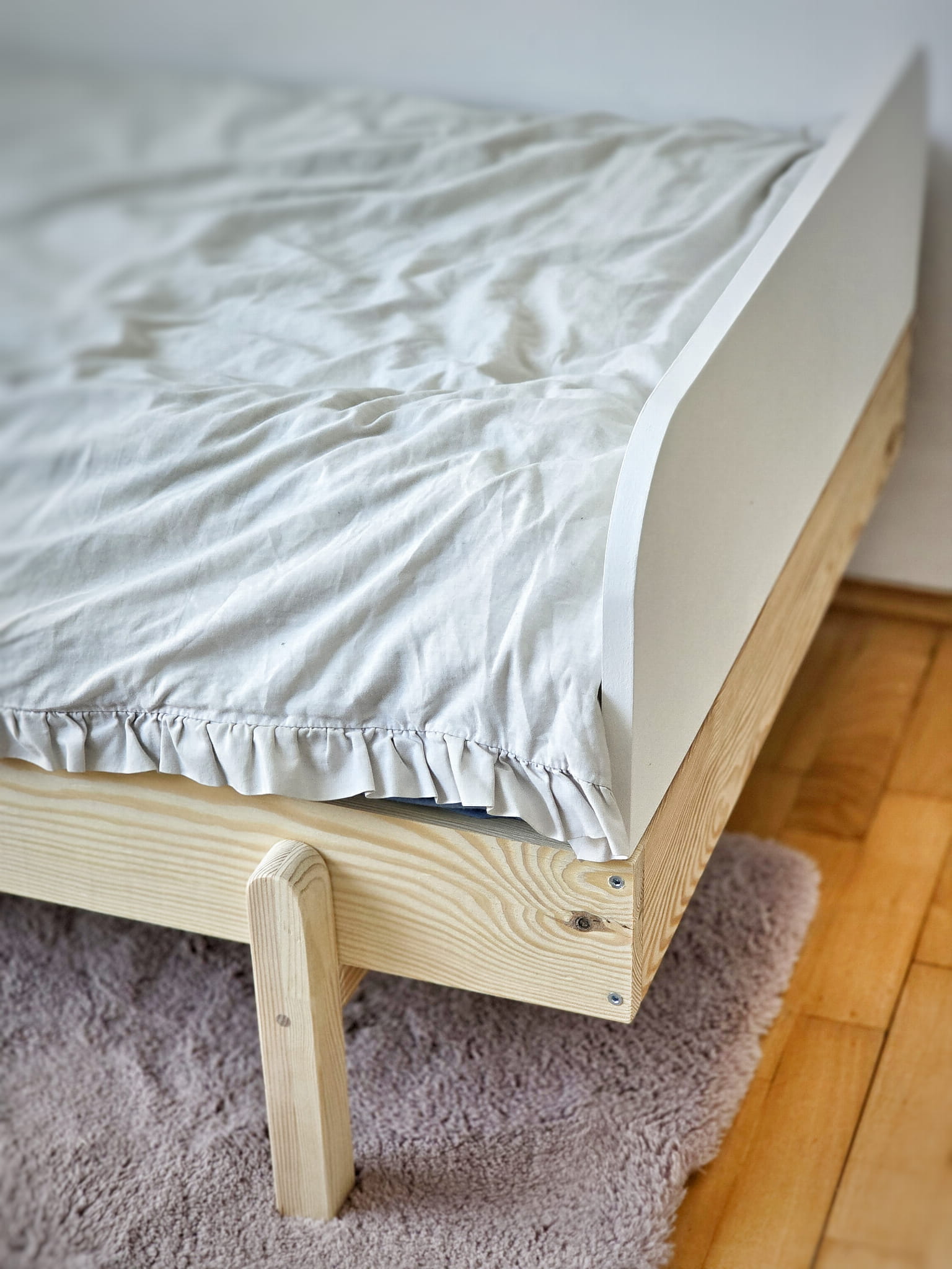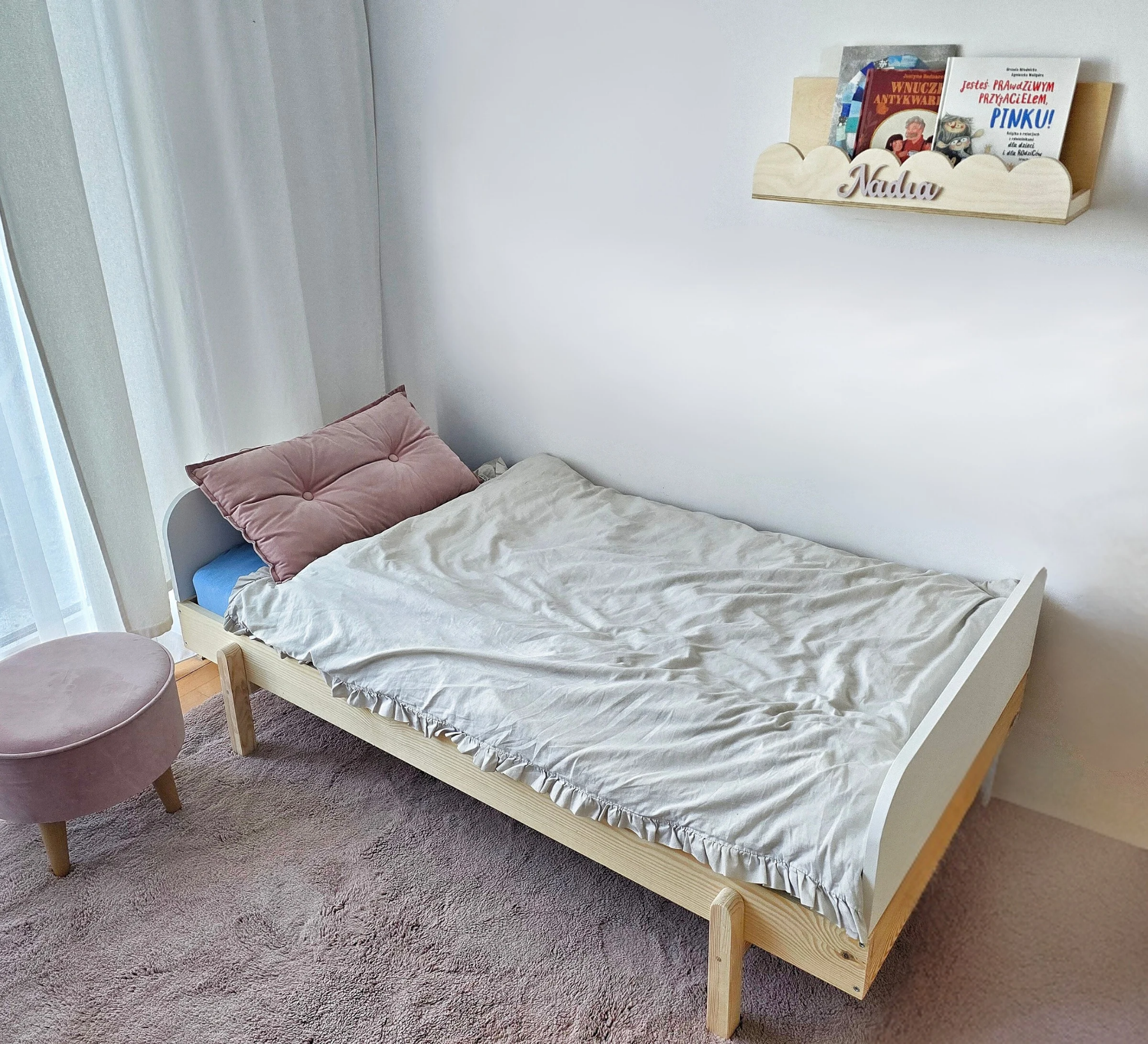 Łóżko wykonane z drewna sosnowego oraz wysokiej klasy płyty MDF pomalowane białą Emalią Akrylową przeznaczoną i bezpieczną dla dzieci oraz matowym bezbarwnym lakierem Z DREWNIANYM STELAŻEM W CENIE.