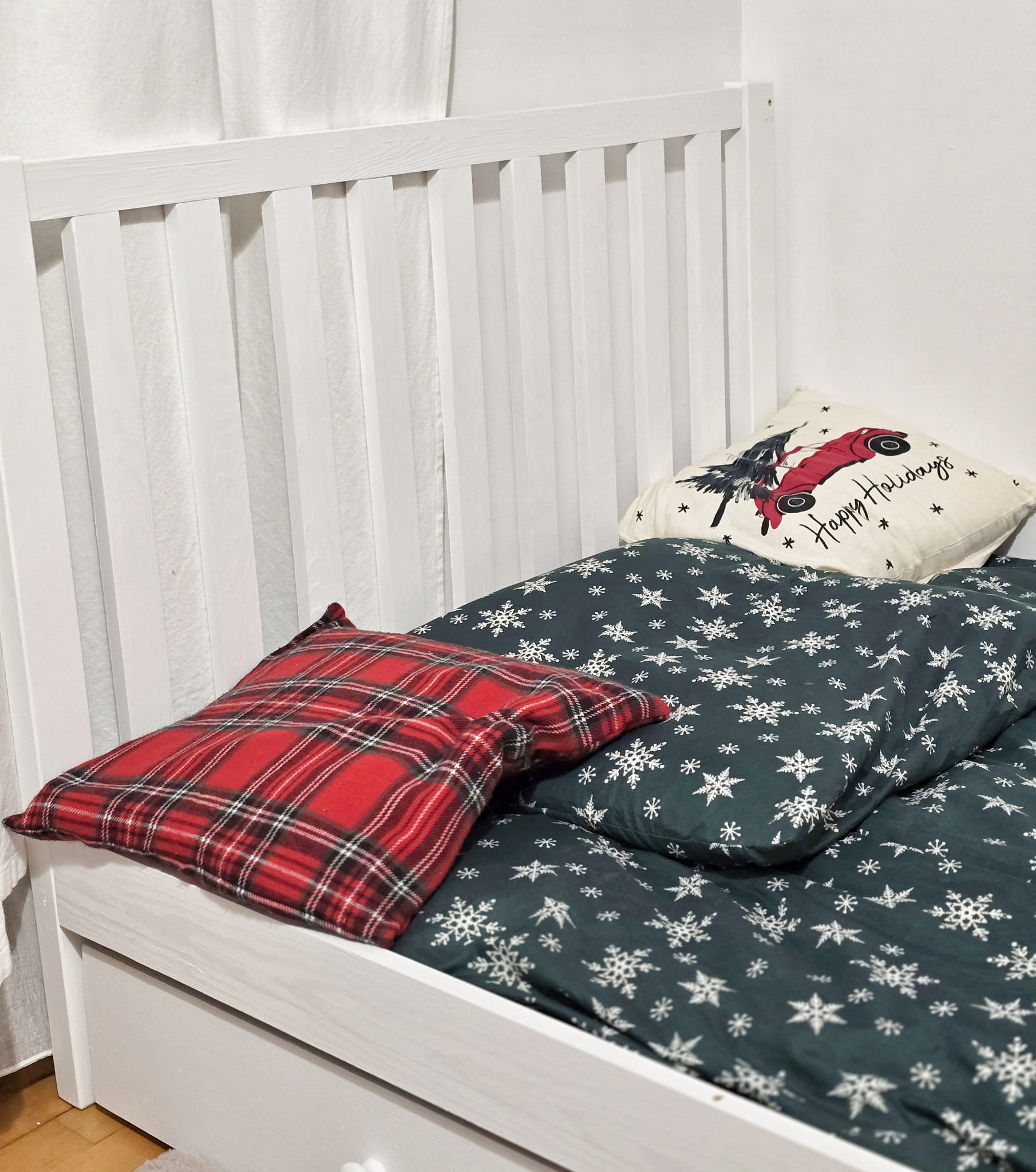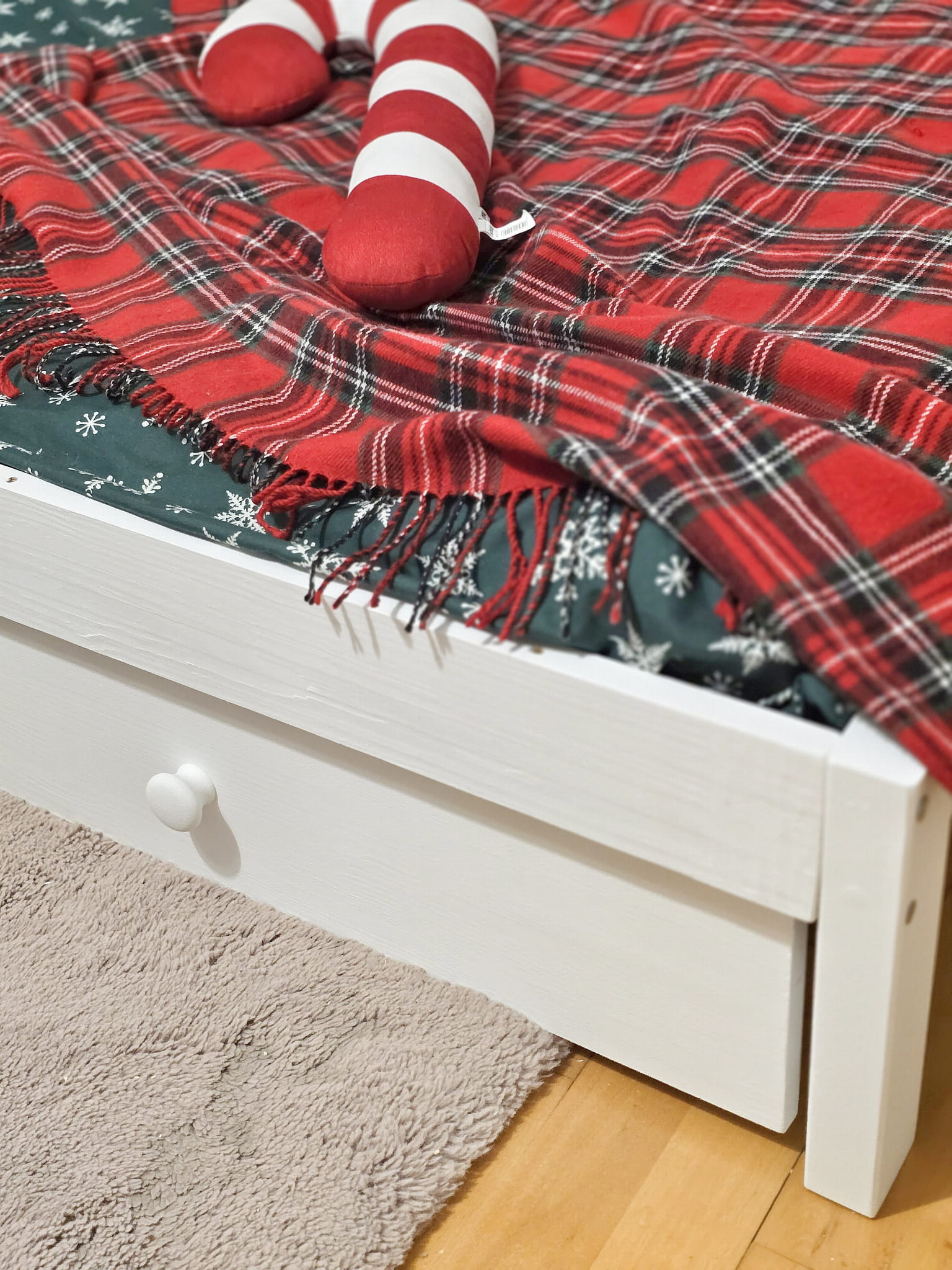 Łóżko wykonane z drewna sosnowego pomalowane białą Ekologiczną Emalią Akrylową bezpieczną i przeznaczoną dla dzieci Z DREWNIANYM STELAŻEM W CENIE. Łóżko z jedną szufladą na gumowych kółkach otwierane za pomocą gałek. Wymiary łóżka ze zdjęcia pod materac 120x200 cm: