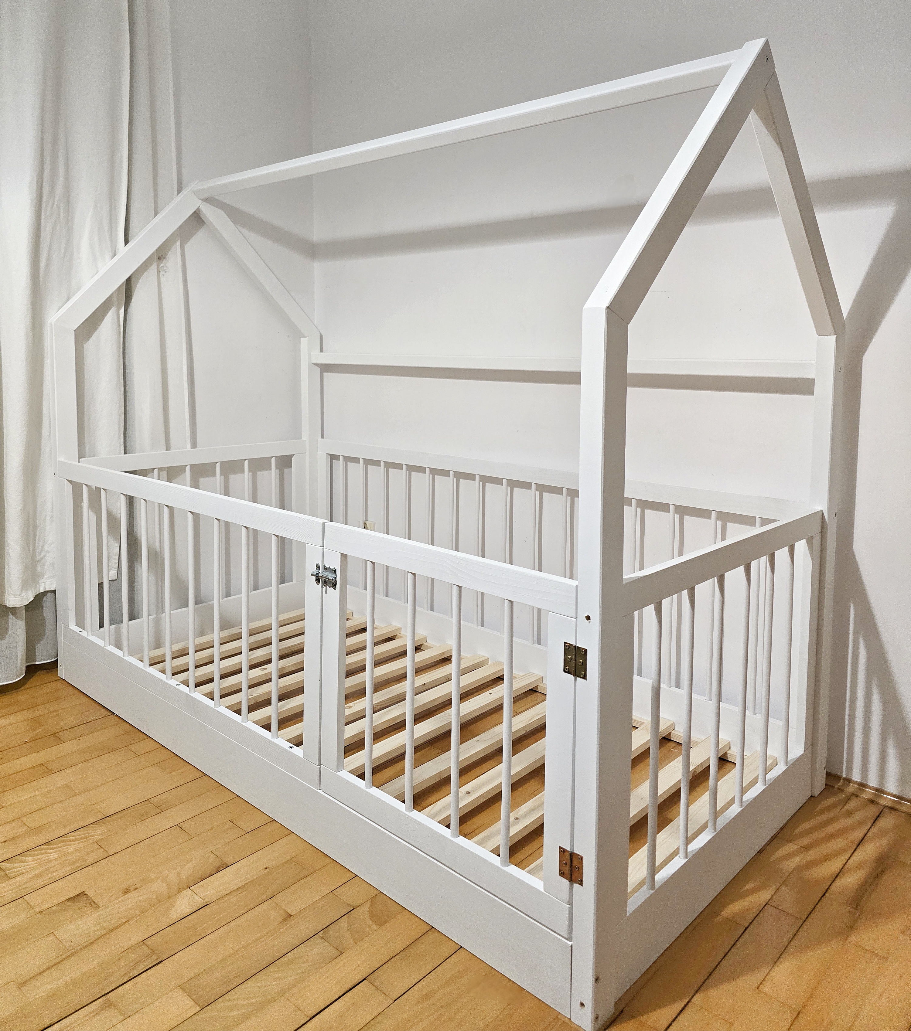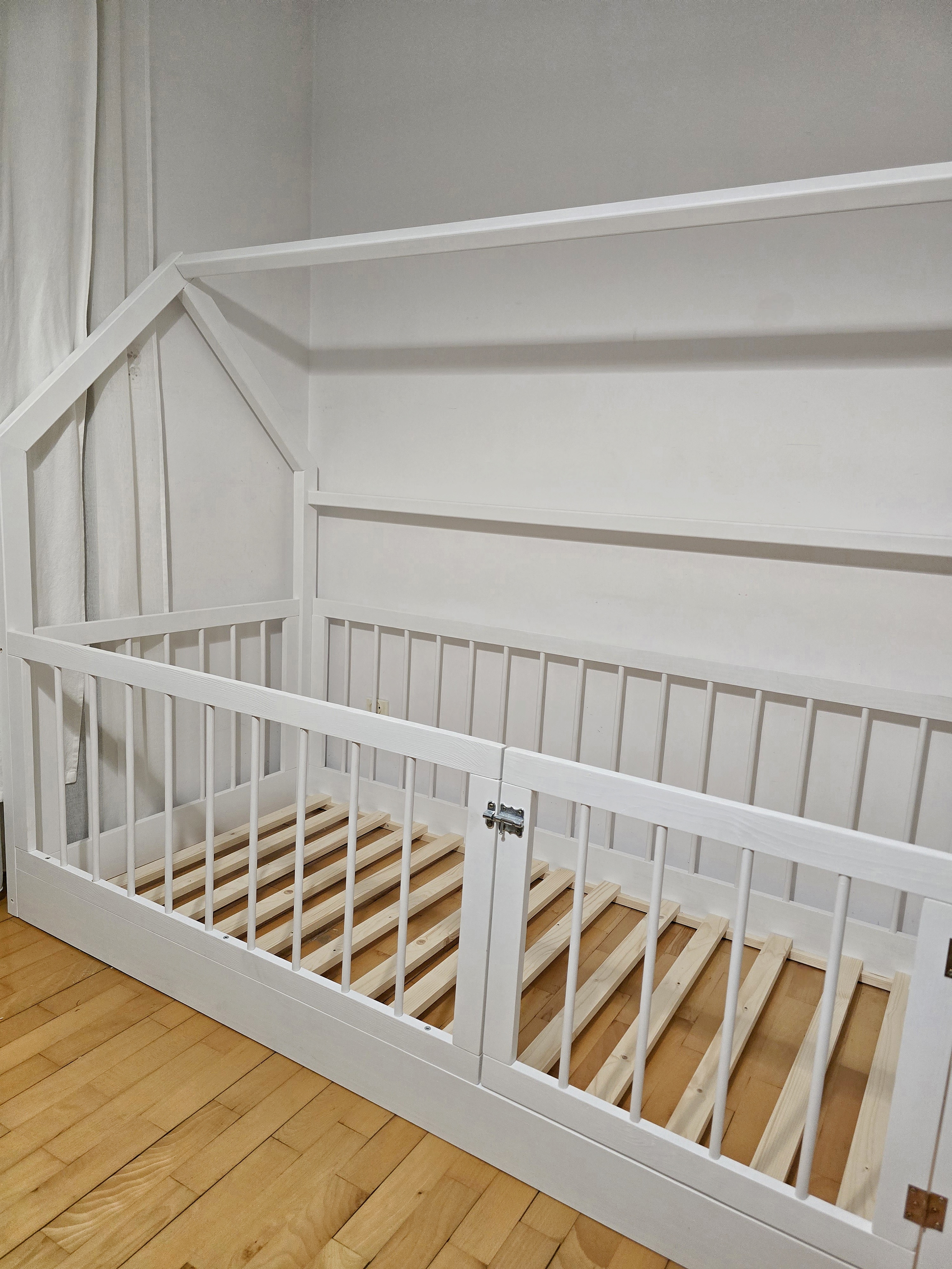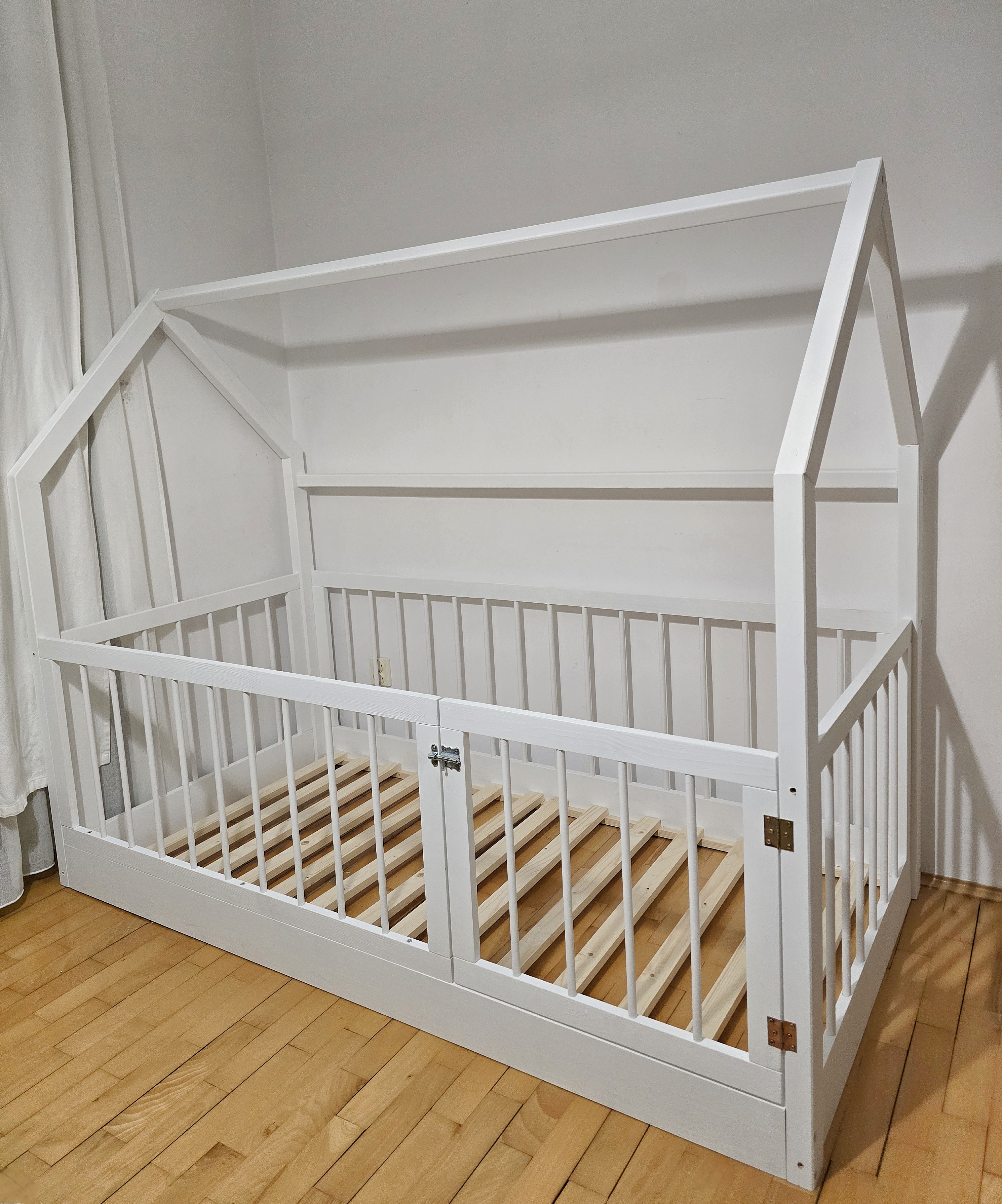 Łóżko przypodłogowe drewniane domek, kojec z bramką i wysokimi okrągłymi szczebelkami białe