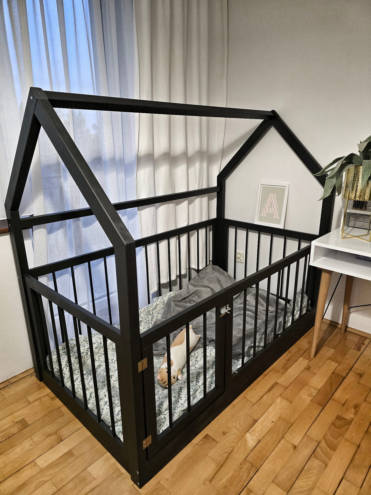 Łóżko przypodłogowe drewniane domek, kojec z bramką i wysokimi okrągłymi szczebelkami czarne