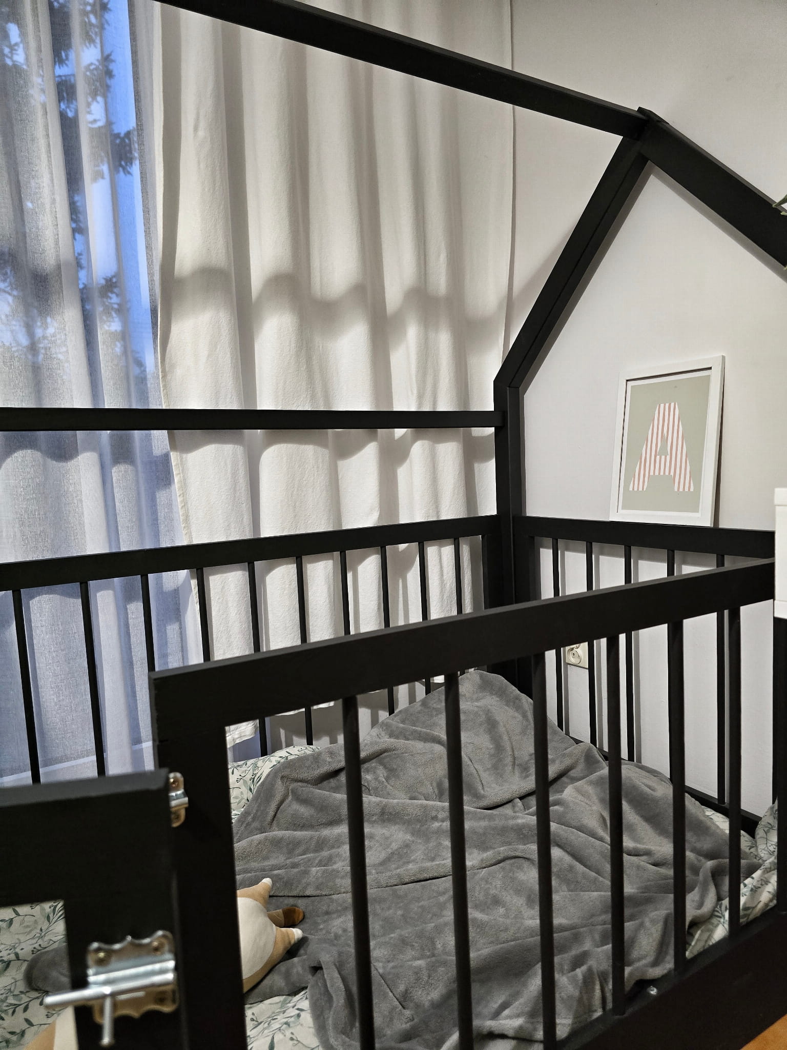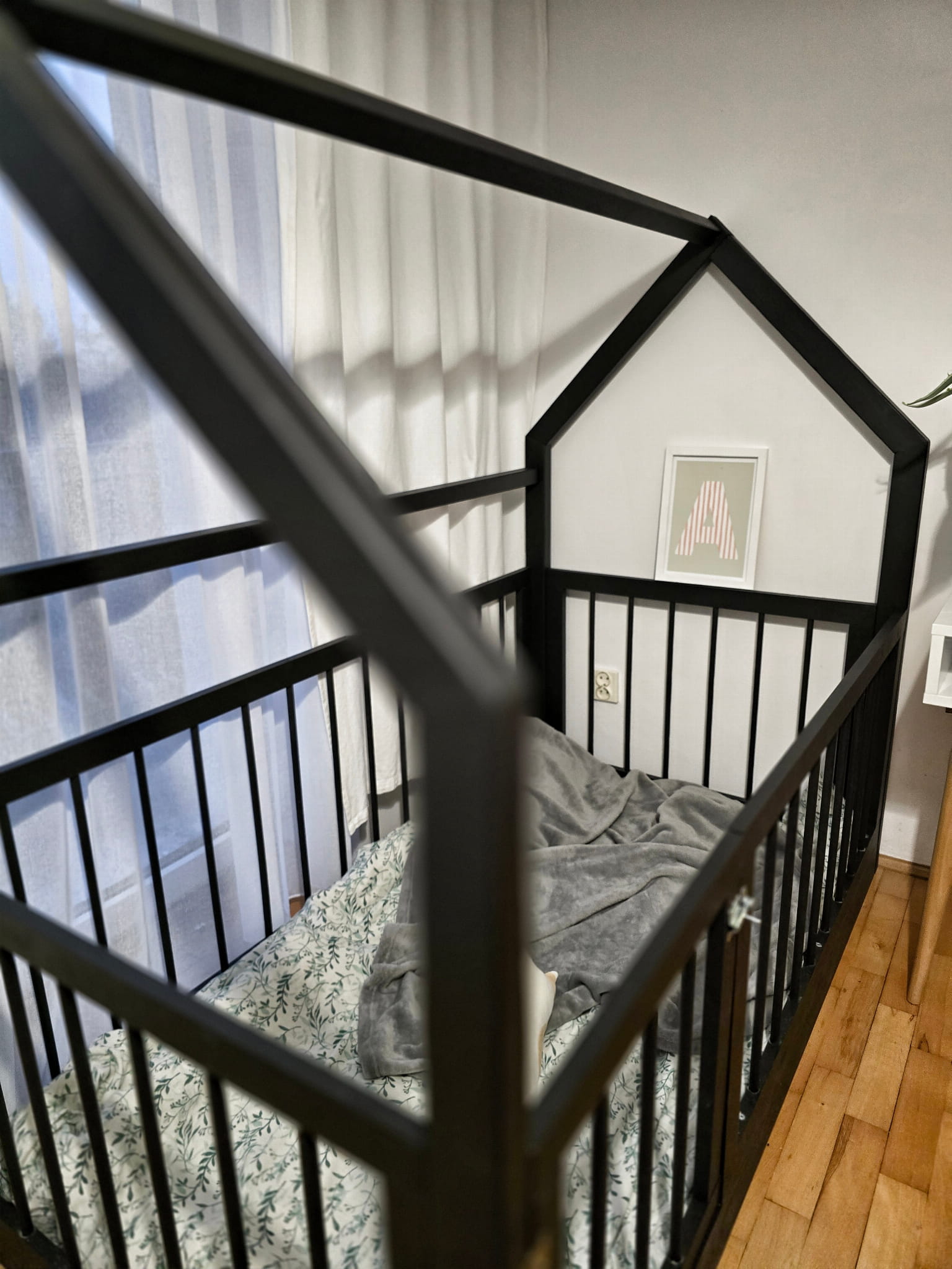 Łóżko domek kojec z bramką i wysokimi barierkami w kolorze czarnym
