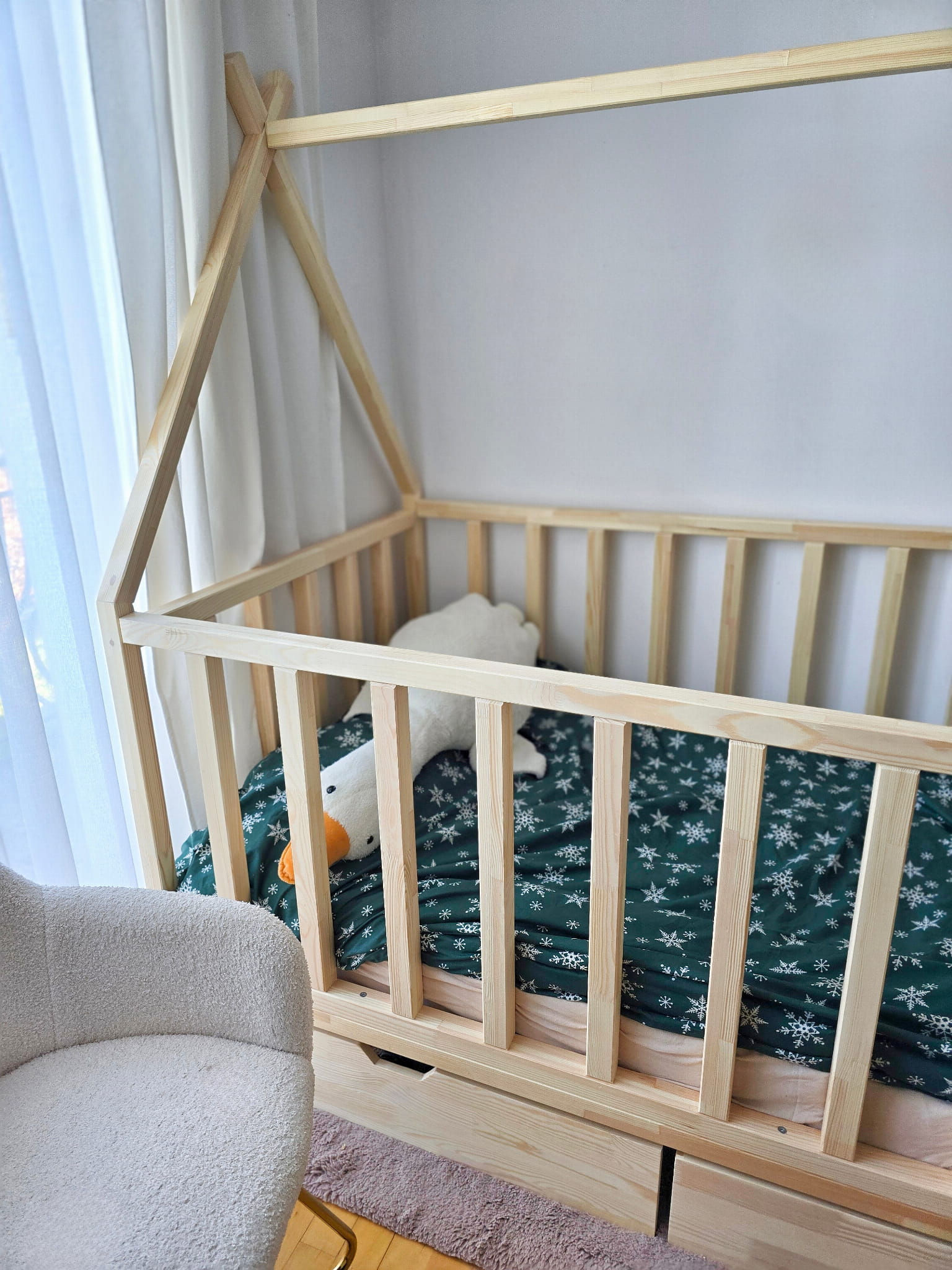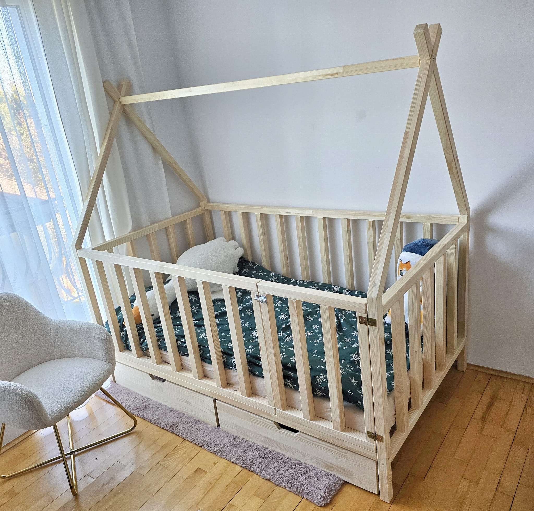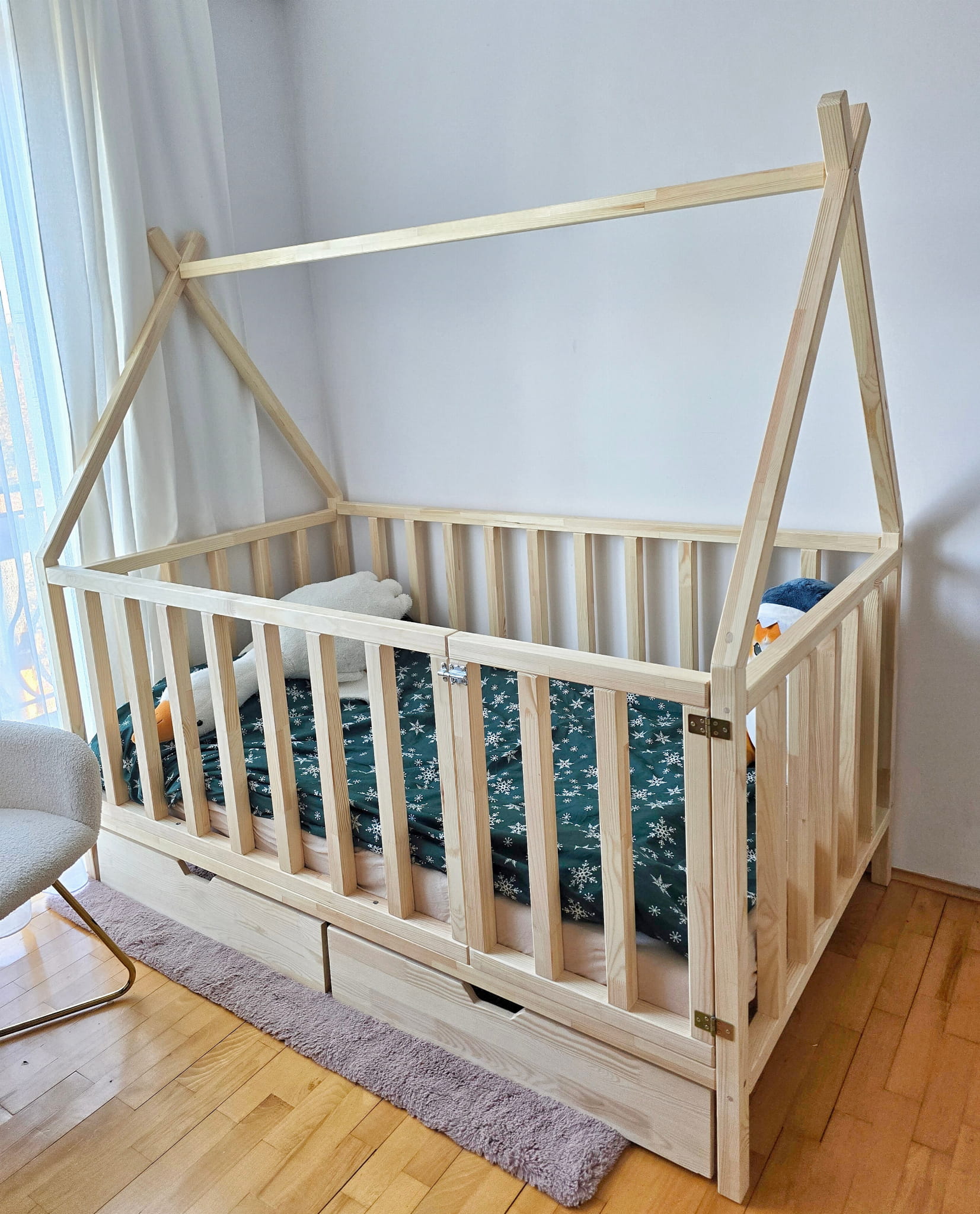 Łóżko w kształcie tipi z bramką i wysokimi barierkami z szufladami