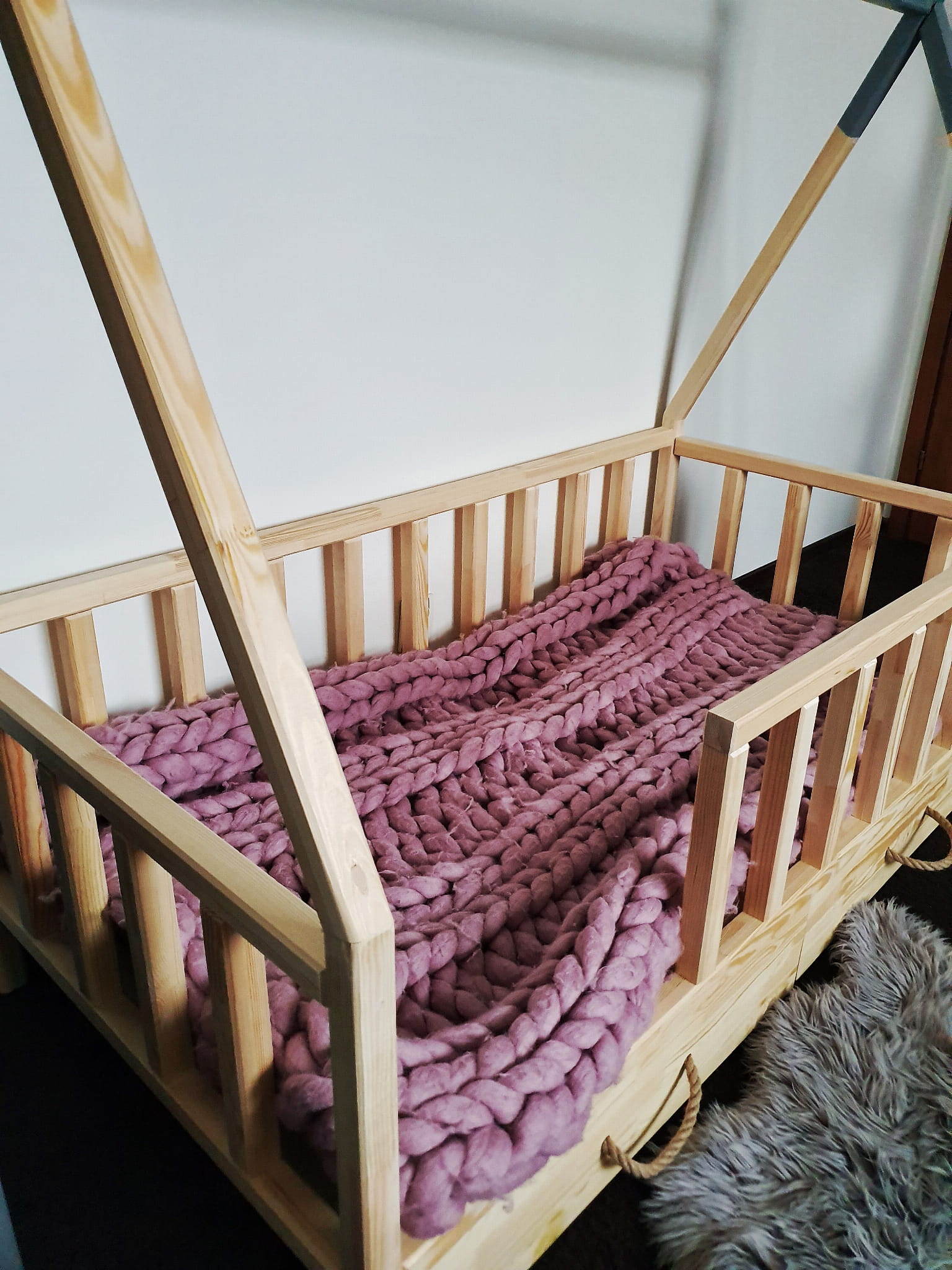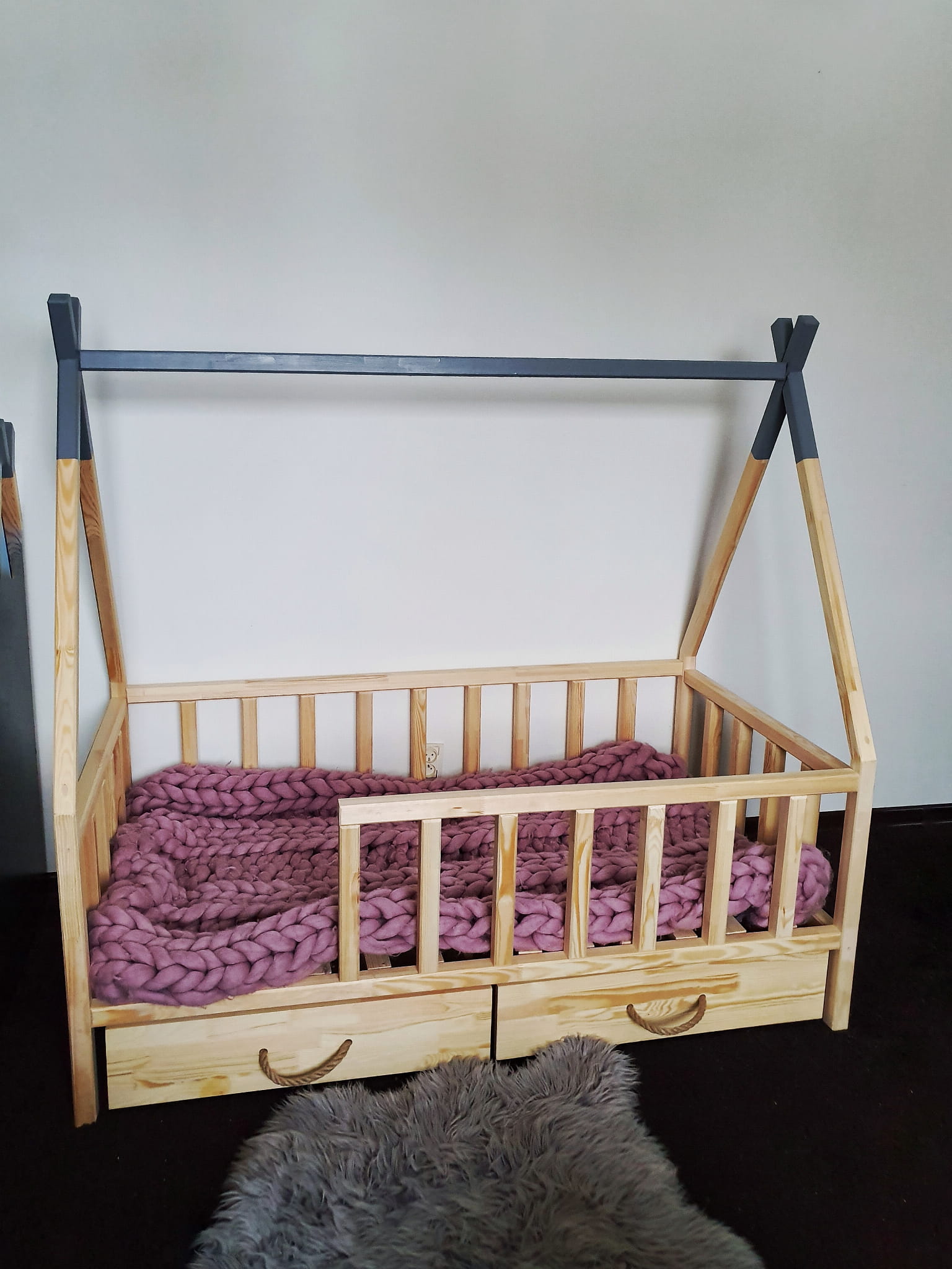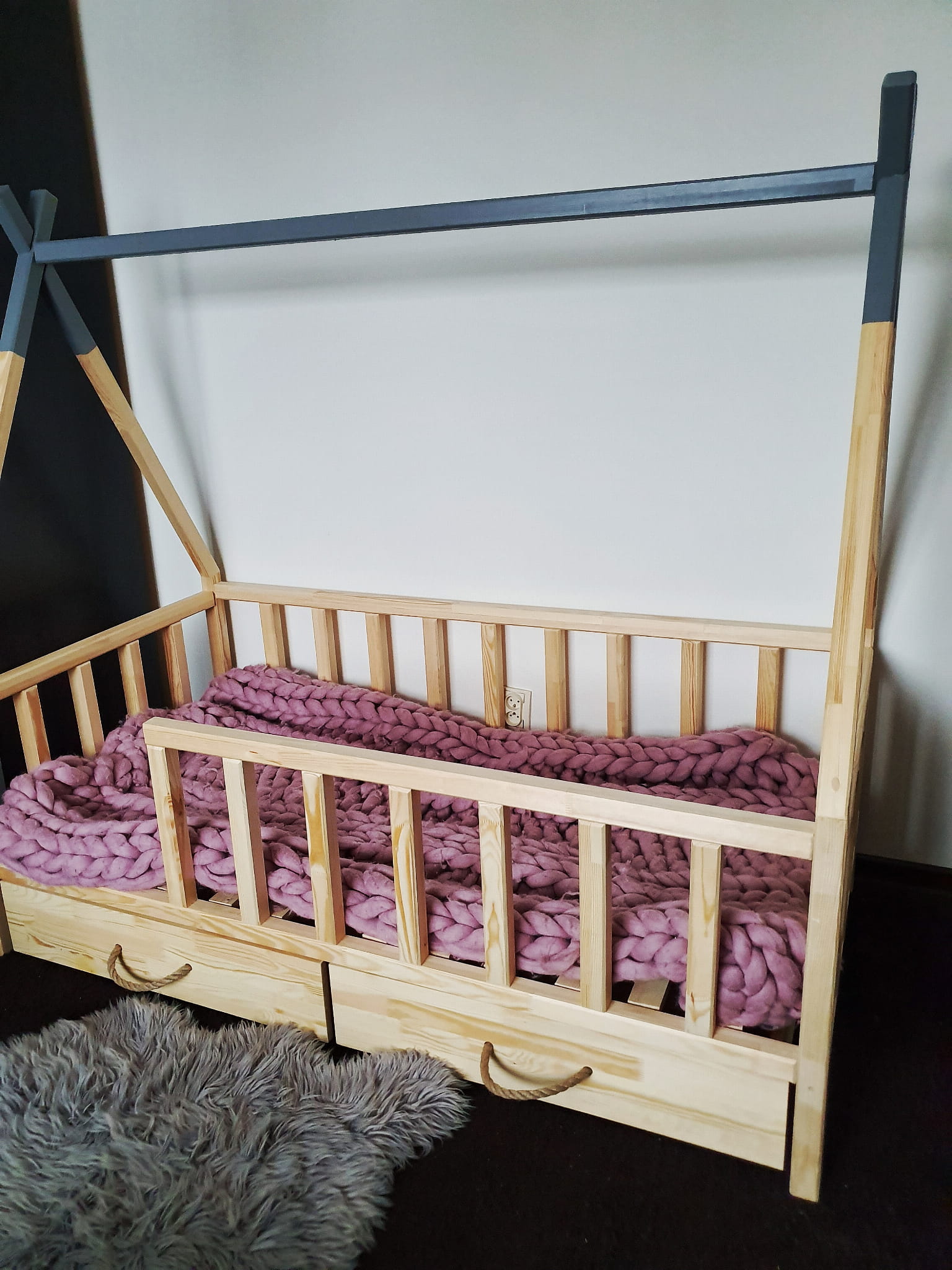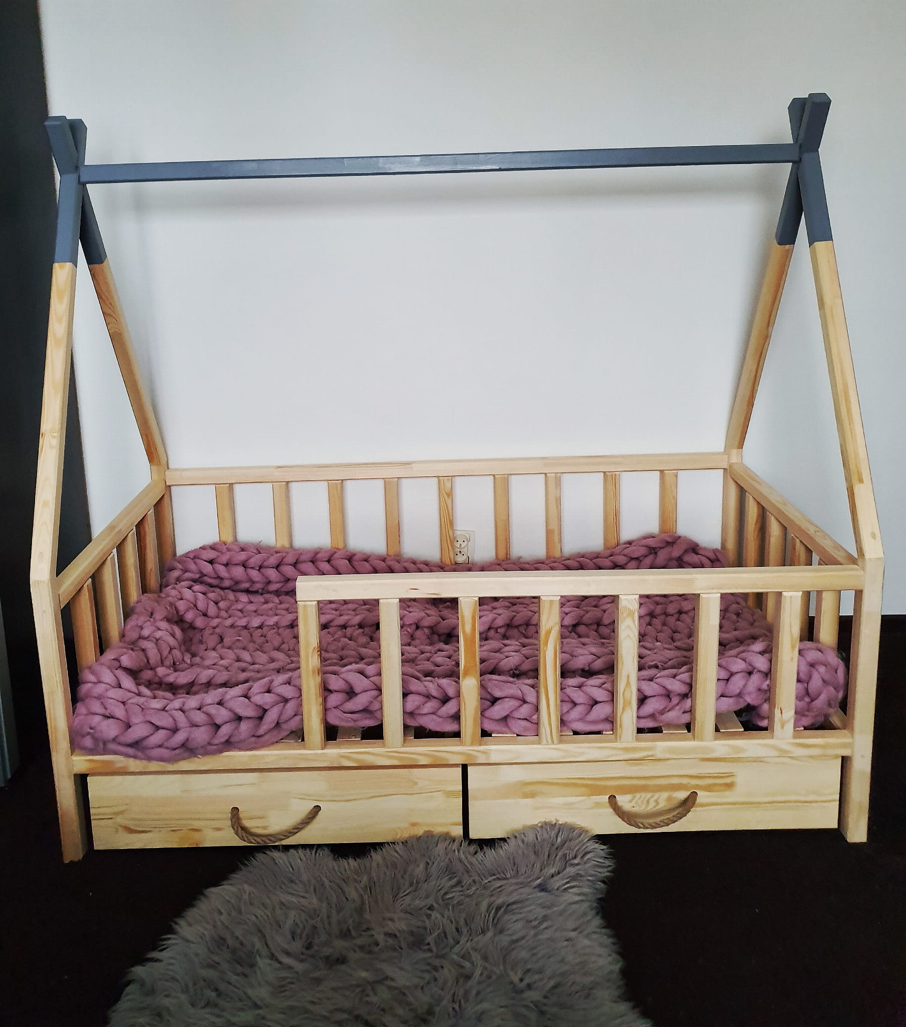 Łóżko wykonane z drewna sosnowego pomalowane naturalnym bezbarwnym lakierem oraz popielatą Ekologiczną Emalią Akrylową bezpieczną i przeznaczoną dla dzieci Z DREWNIANYM STELAŻEM W CENIE. Łóżko posiada barierki zabezpieczające wokół łóżka możliwość zmiany strony wejścia do łóżka. Belki łagodnie wyfrezowane, które eliminują ostre krawędzie. BARIERKA PRZEDNIA DEMONTOWALNA. Łóżko posiada dwie szufladki na kółkach otwierane za pomocą jutowej liny.