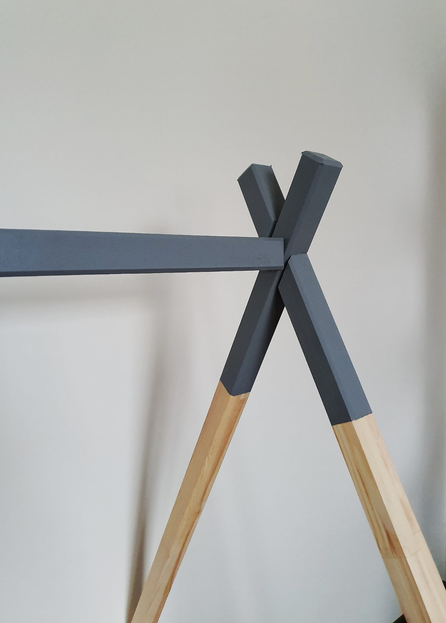 Łóżko w kształcie tipi z szufladkami w kolorze naturalnego drewna z popielatym dekorem