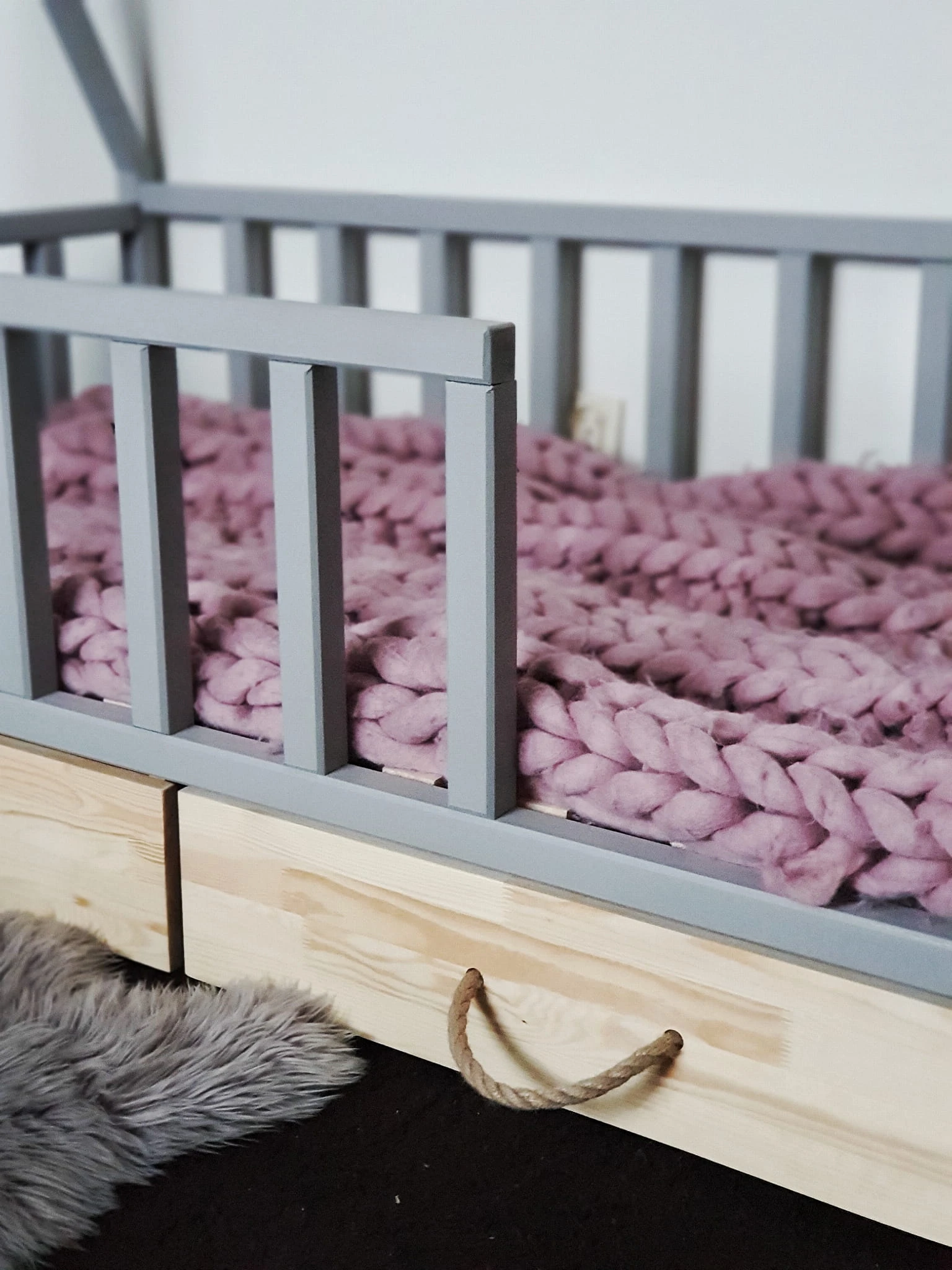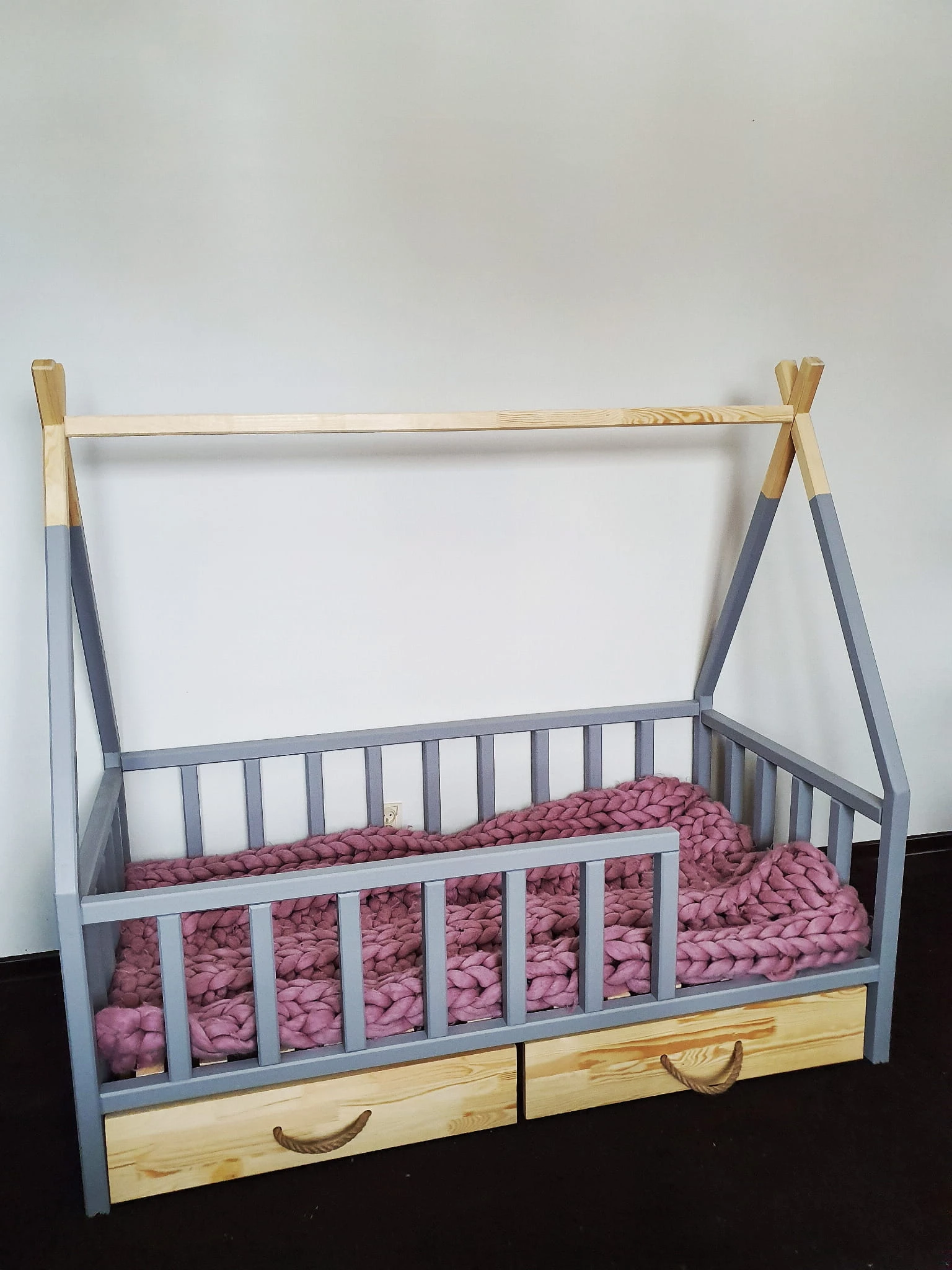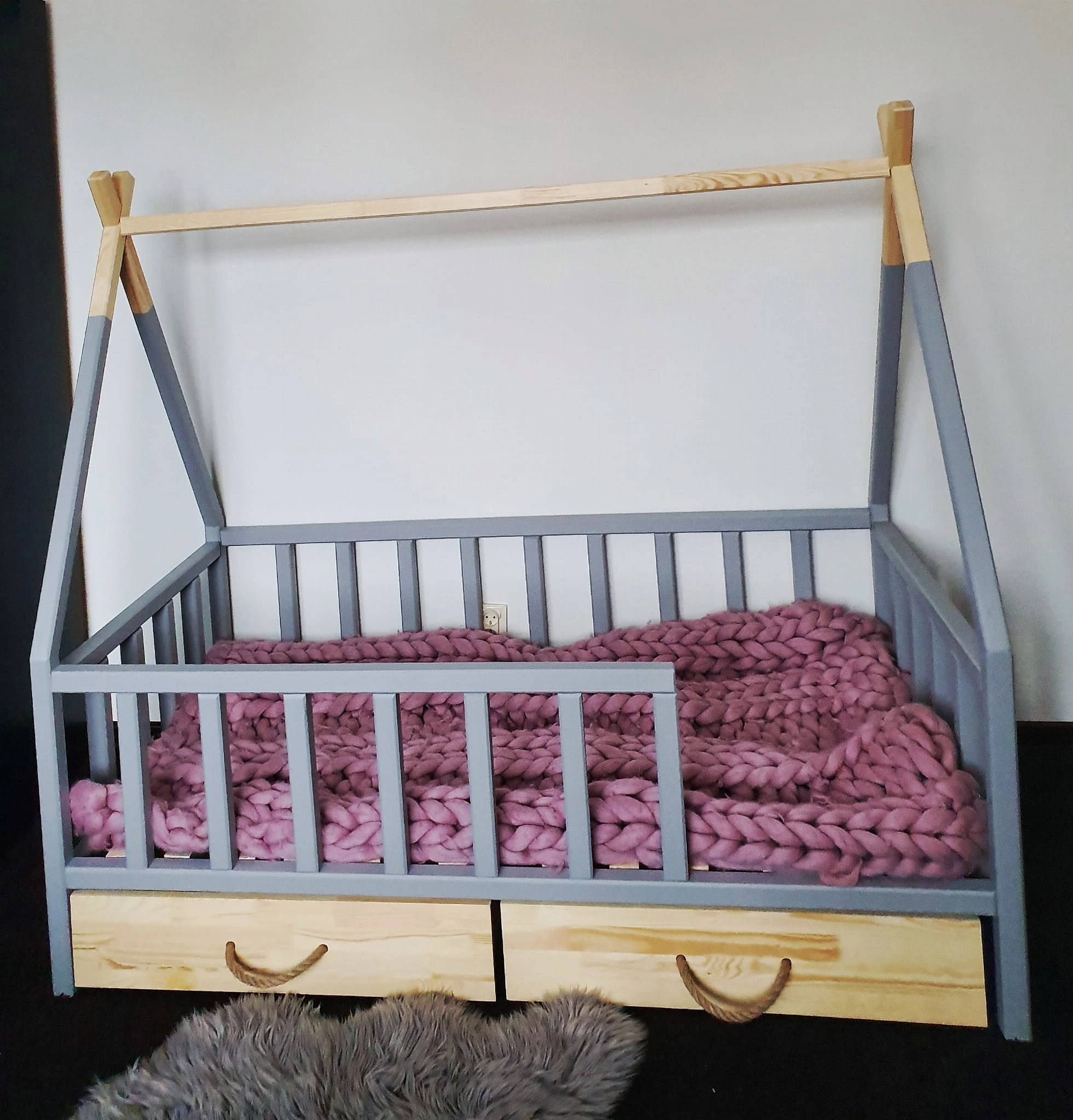 Łóżko wykonane z drewna sosnowego pomalowane szarą Ekologiczną Emalią Akrylową bezpieczną i przeznaczoną dla dzieci oraz bezbarwnym lakierem Z DREWNIANYM STELAŻEM W CENIE. Łóżko posiada barierki zabezpieczające wokół łóżka możliwość zmiany strony wejścia do łóżka. Belki łagodnie wyfrezowane, które eliminują ostre krawędzie. BARIERKA PRZEDNIA DEMONTOWALNA. Łóżko posiada dwie szufladki na kółkach otwierane za pomocą jutowej liny.