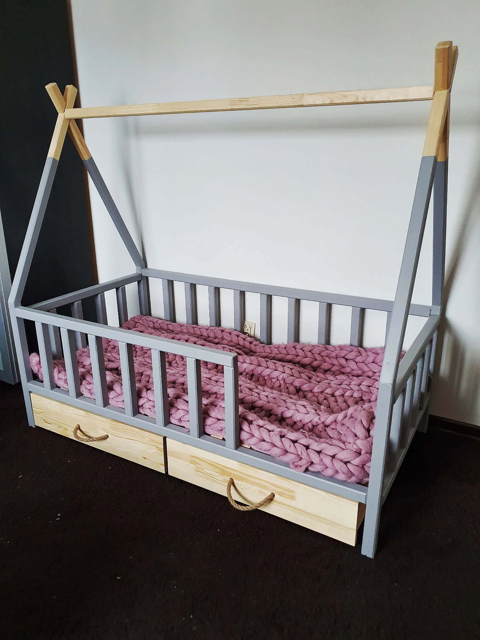 Łóżko tipi dziecięce szare z drewnianym dekorem z szufladami - warianty