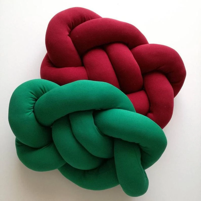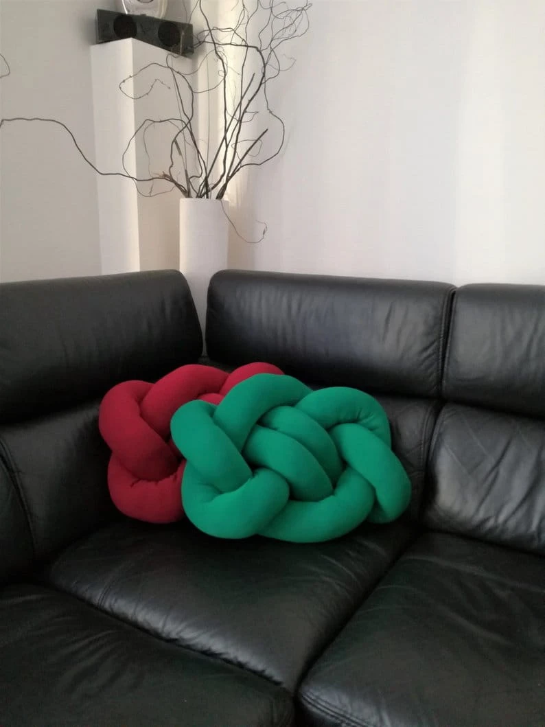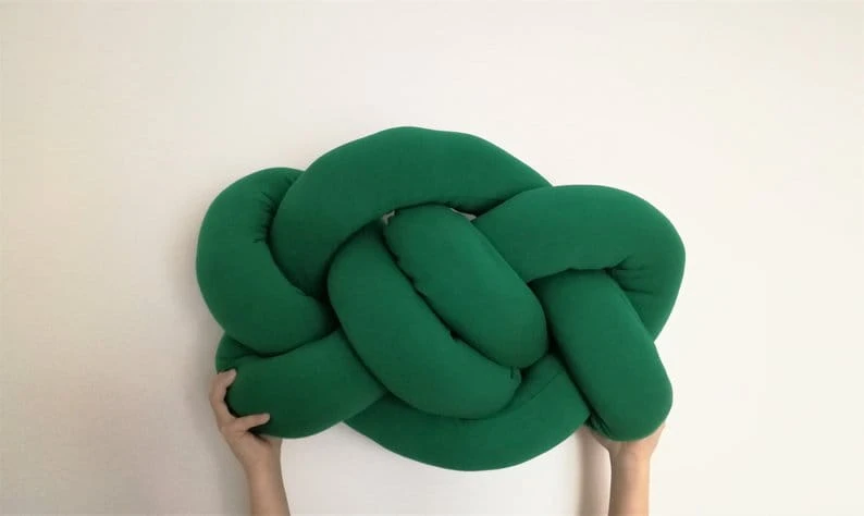 Poduszka supeł o grubym splocie w kolorze butelkowej zieleni.