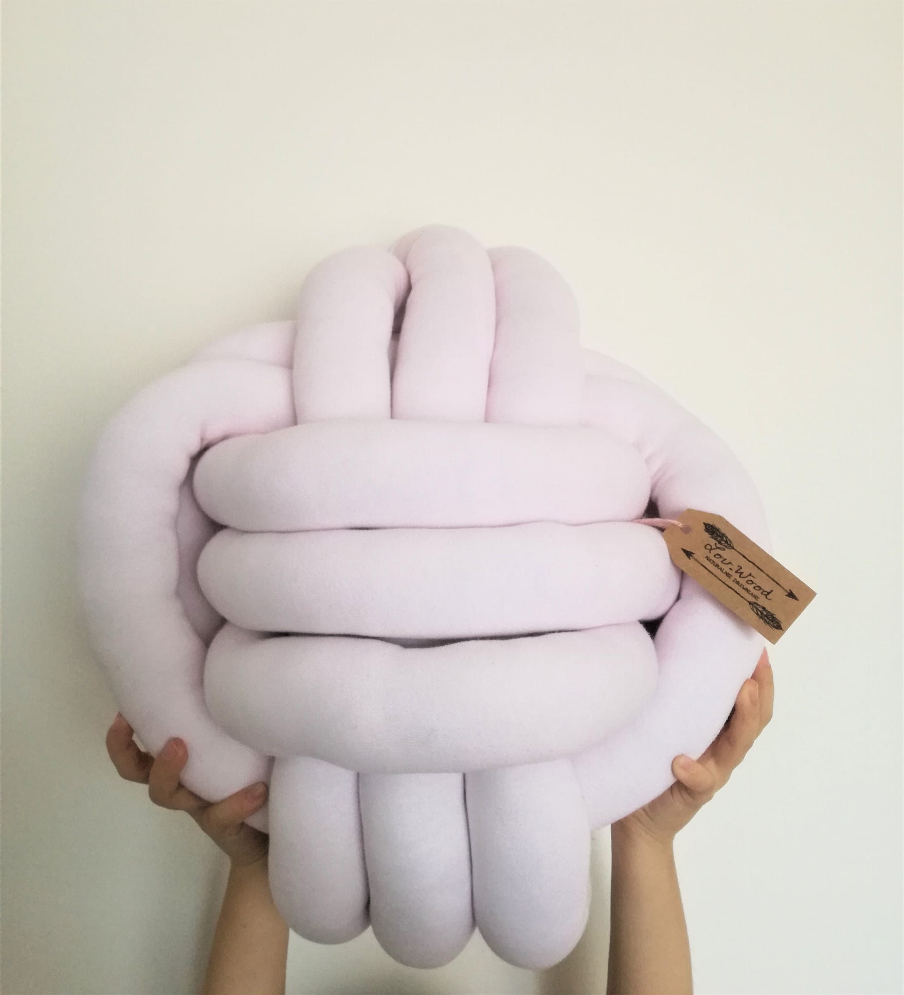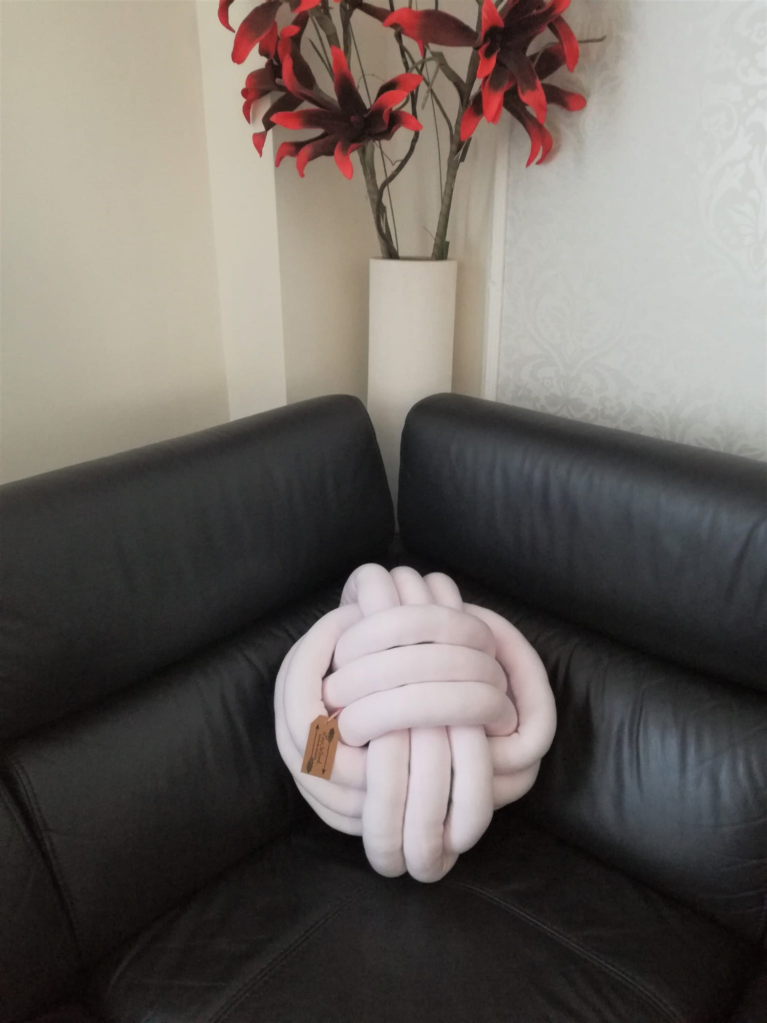 Poduszka supeł w kształcie piłki w kolorze bladego różu.