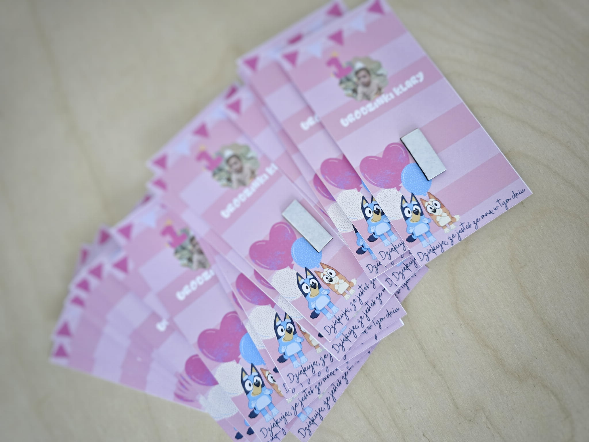 Podziękowanie urodzinowe Bluey ze zdjęciem wersja różowa