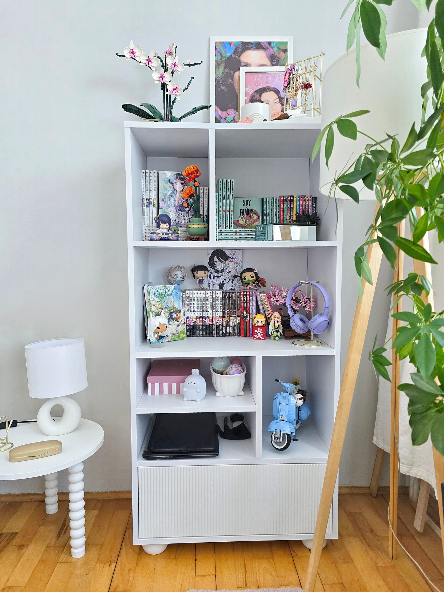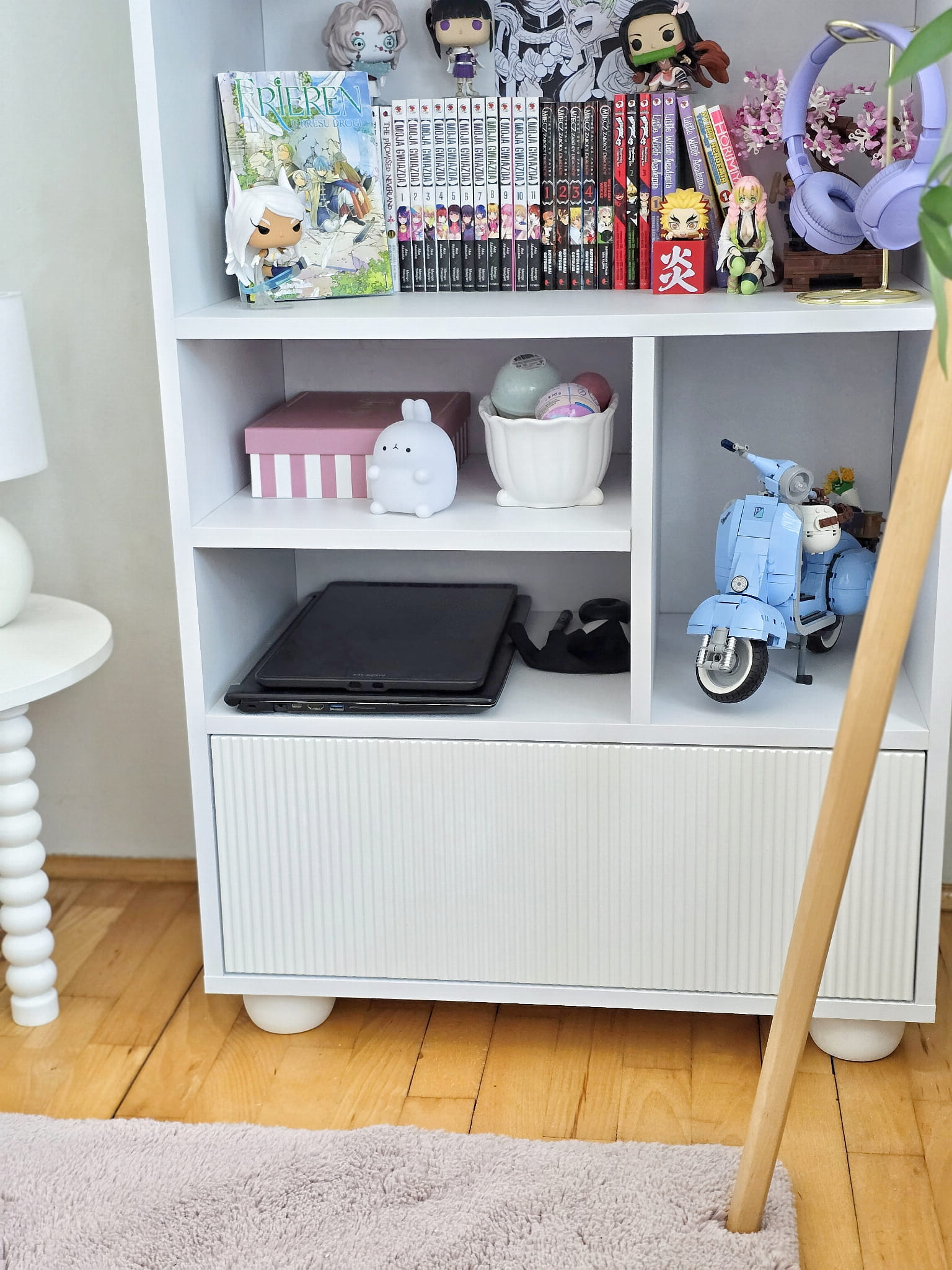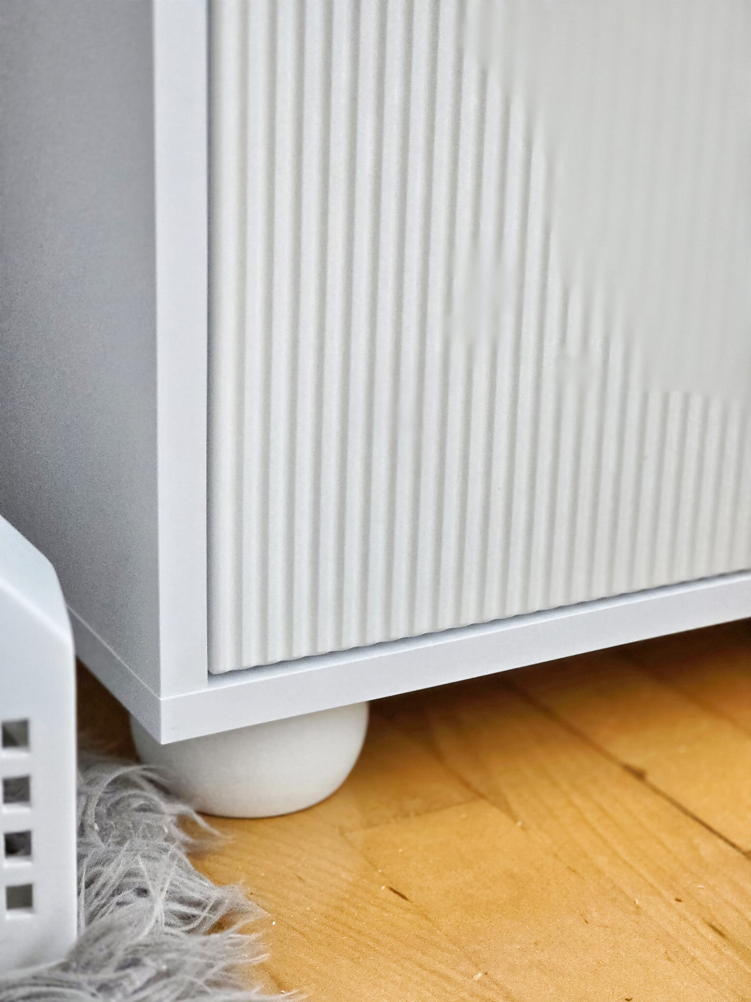 Regał wykonany z białej płyty meblowej, ozdobnej ryflowanej szuflady wykonanej z MDFU oraz lakierowanej na kolor biały oraz okrągłych białych nóg