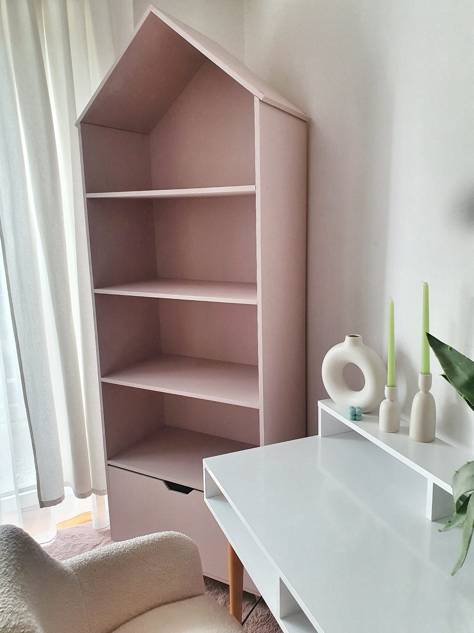 Półka regał na książki i zabawki w kształcie domku wykonany z drewnianej sklejki sosnowej z nóżkami z drewna bukowego. Regał pomalowany w kolorze pudrowego różu.