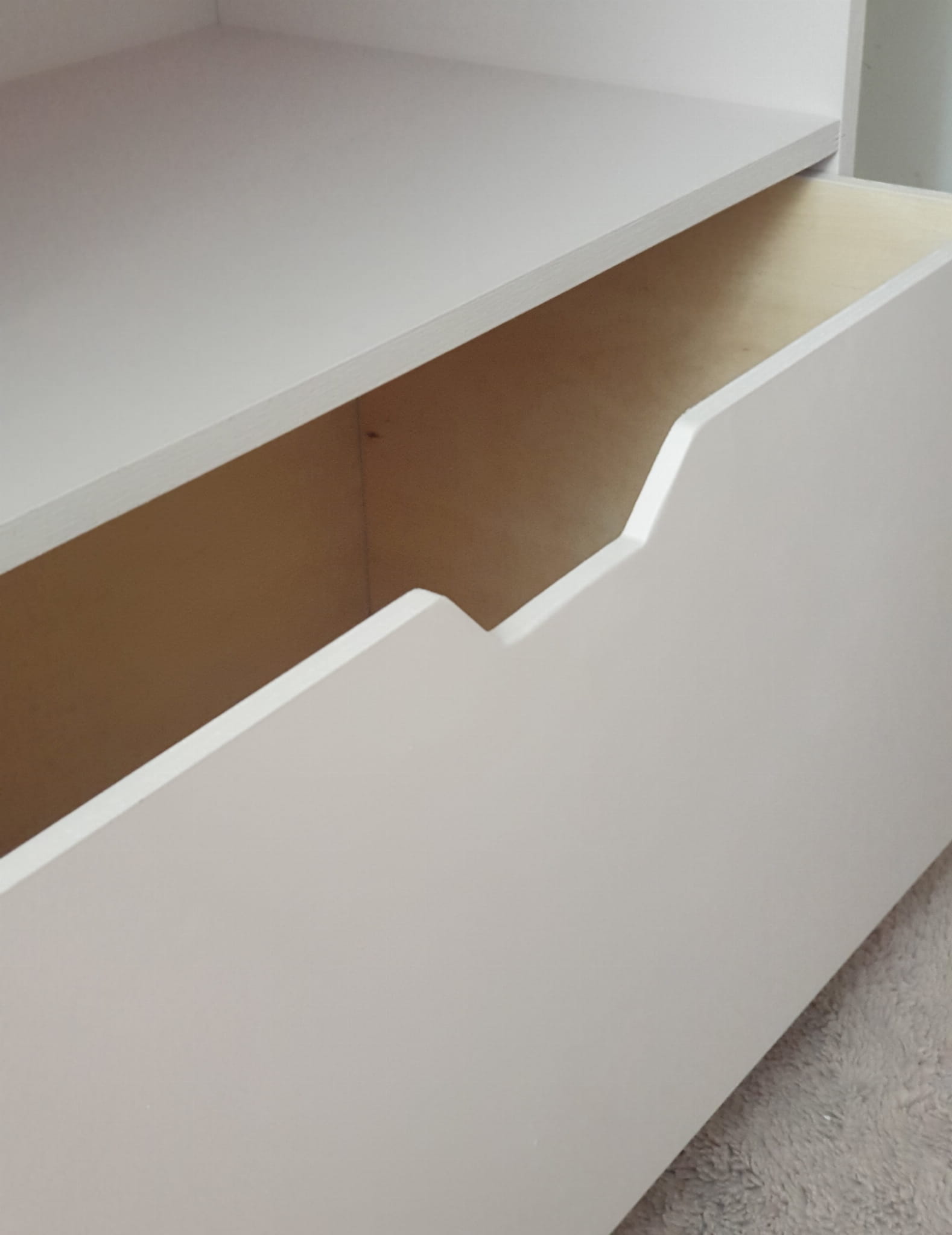 Domek posiada wkładaną szufladę/skrzynie z wyfrezowanym uchwytem.