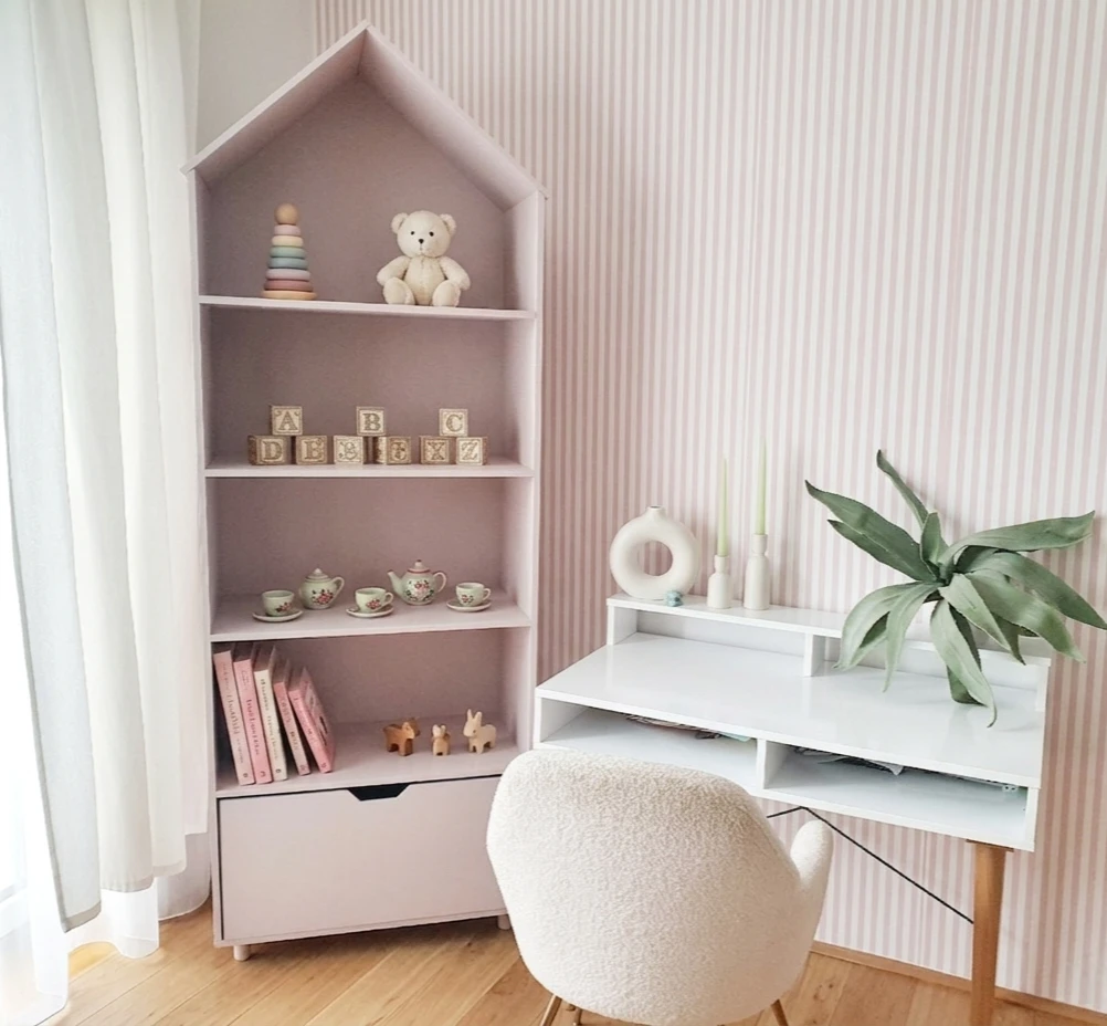 Regał domek drewniany dla dzieci z szufladą pudrowy róż