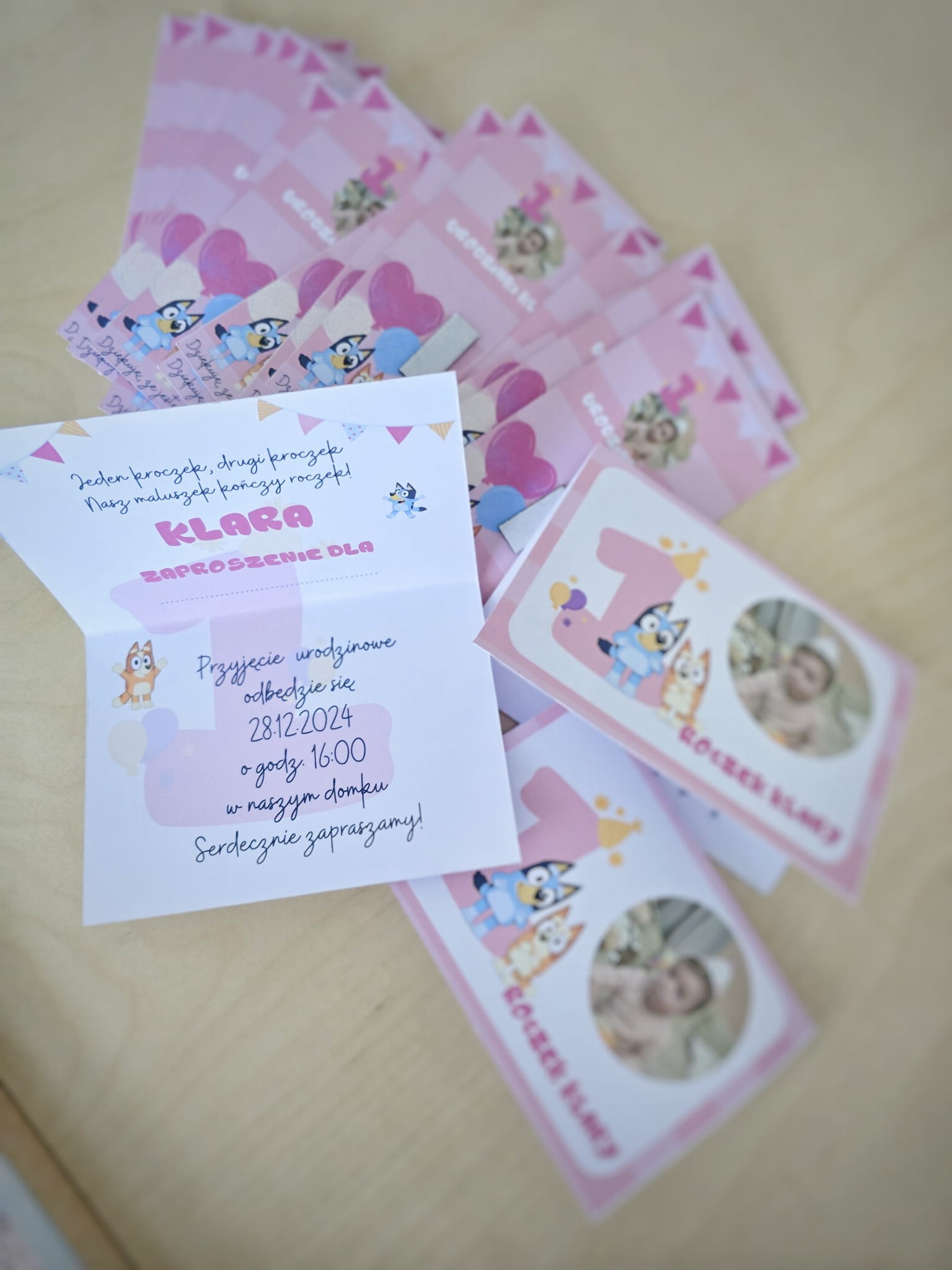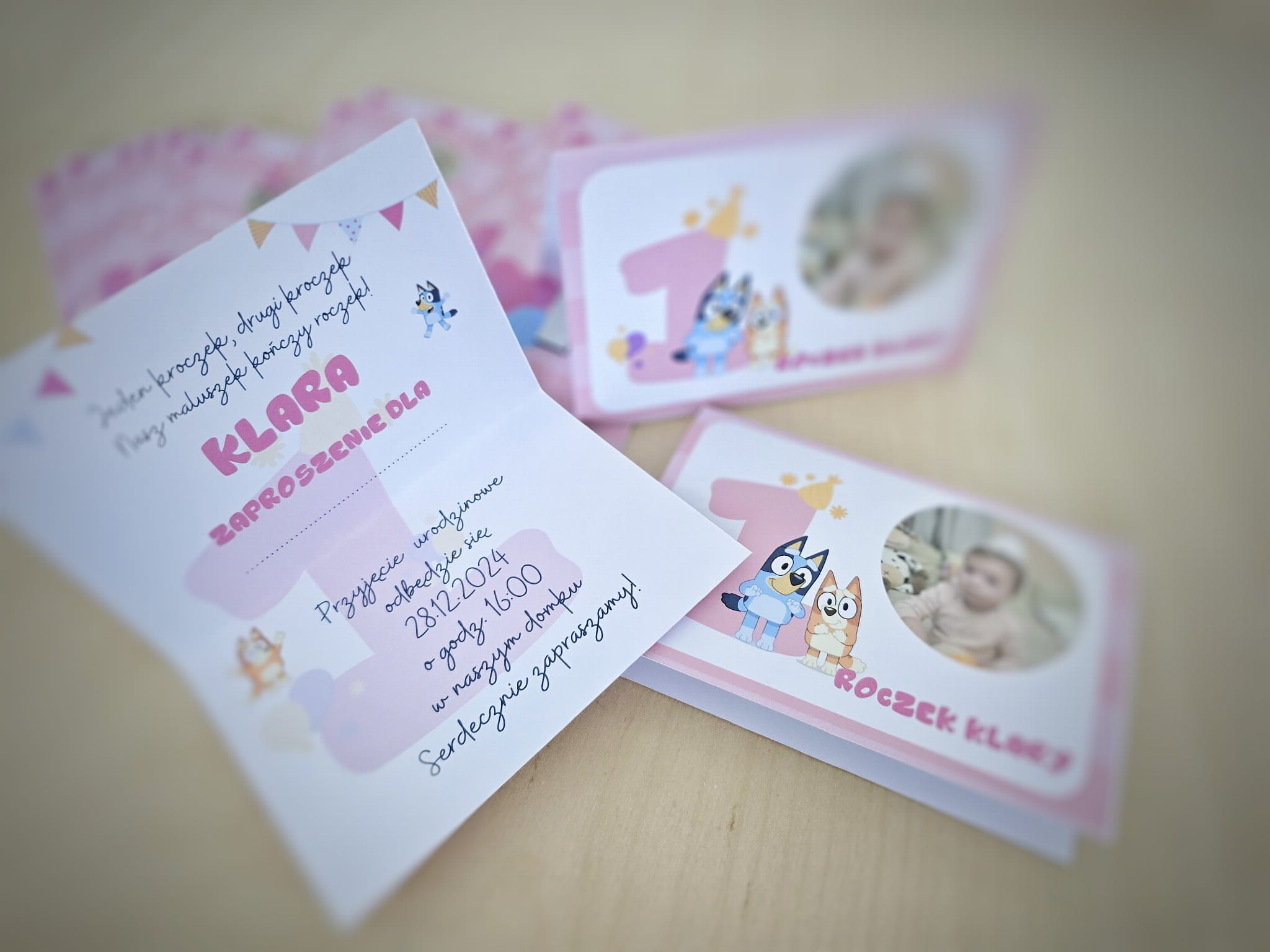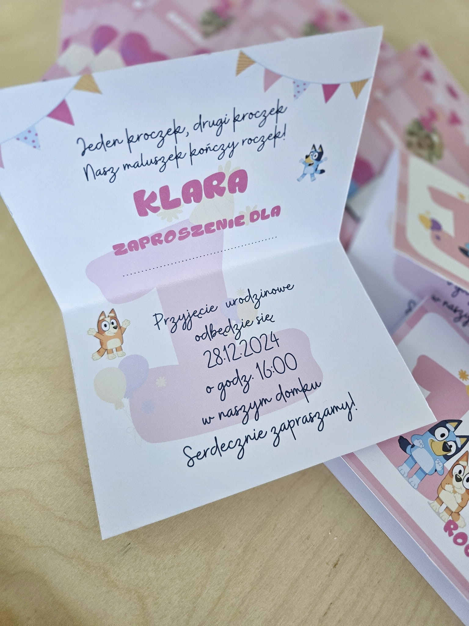 Zaproszenie rozkładane z wzorem Bluey ze zdjęciem dziecka