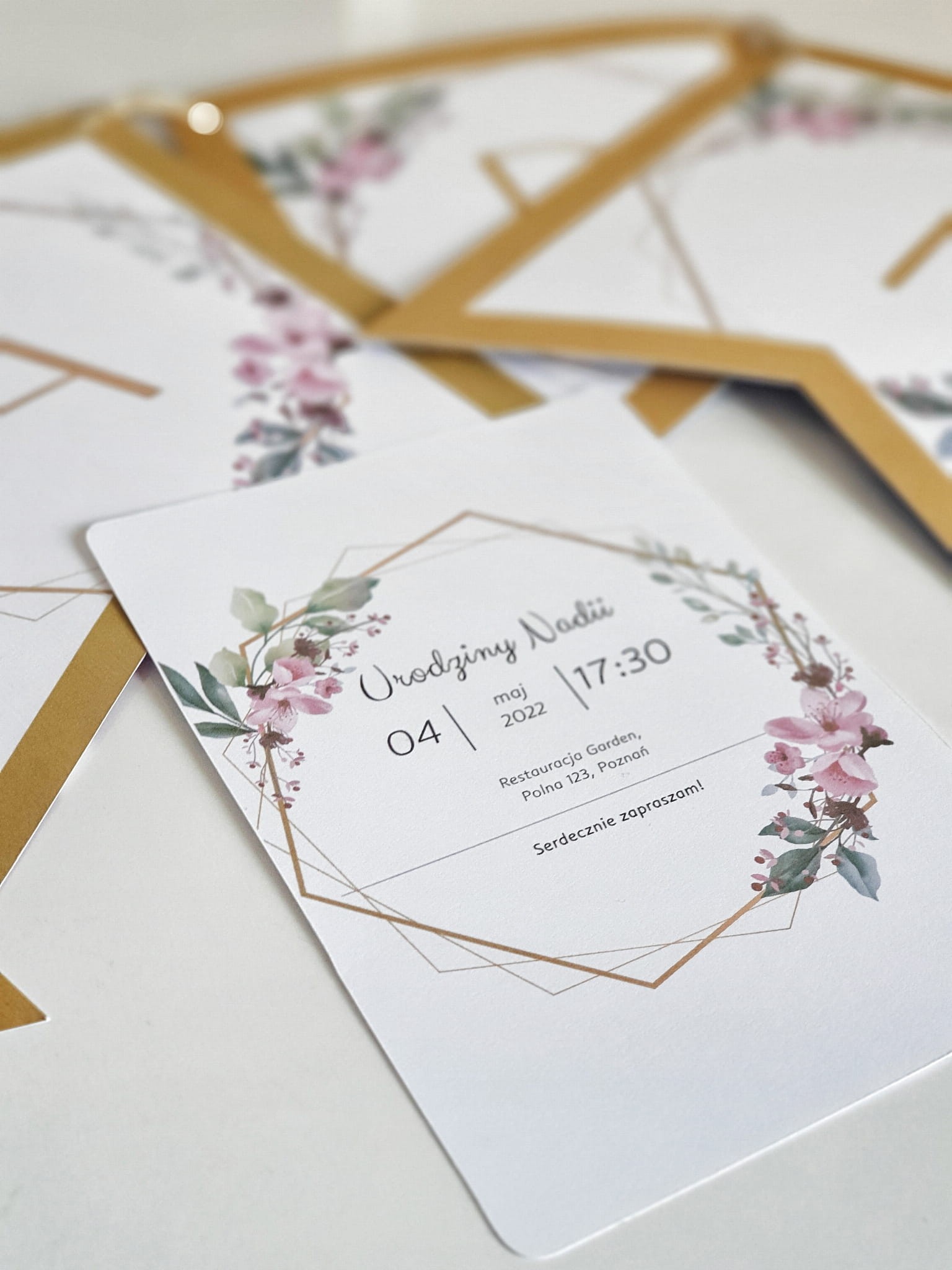 Zaproszenie z wzorem kwiatów w złotej ozdobnej ramce